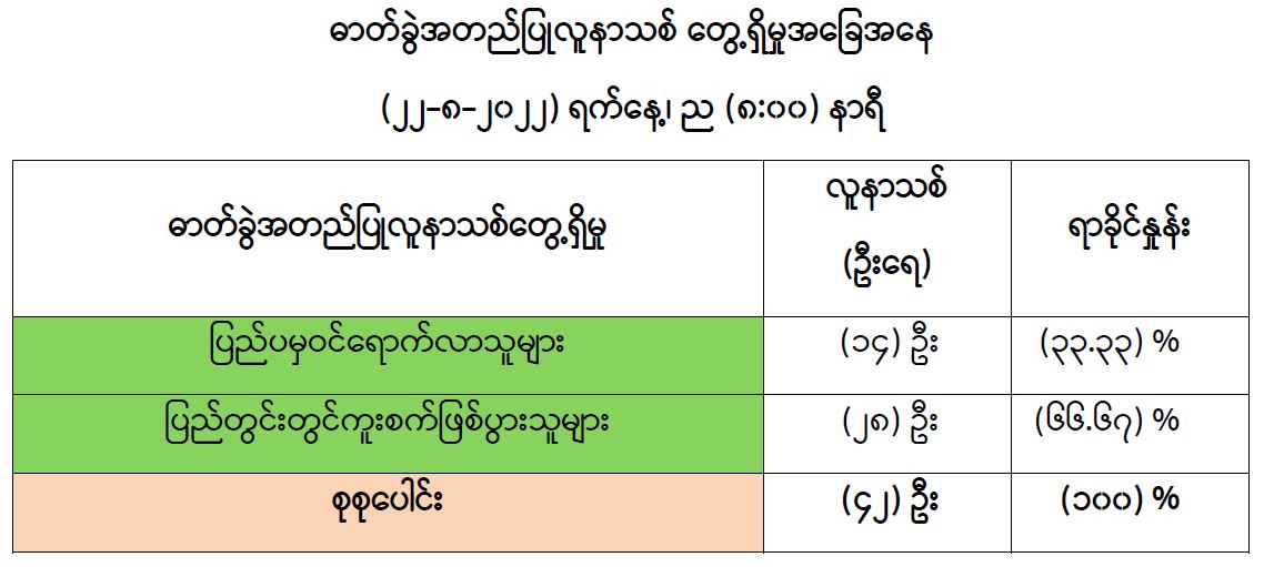 COVID-19 သံသယလူနာများ၊ ဓာတ်ခွဲအတည်ပြုလူနာနှင့် အနီးကပ်ထိတွေ့ခဲ့သူများနှင့် အသွားအလာကန့်သတ်ထားရှိသူများအား COVID-19 ရောဂါ ရှိ၊ မရှိ ဓာတ်ခွဲစစ်ဆေးခြင်း ပုံမှန် ဆောင်ရွက်လျက်ရှိပြီး (၂၁-၈-၂၀၂၂) ရက်နေ့၊ ည (၈:၀၀) နာရီမှ (၂၂-၈-၂၀၂၂) ရက်နေ့၊ ည (၈:၀၀) နာရီအတွင်း ဓာတ်ခွဲနမူနာစုစုပေါင်း (၈,၁၈၆) ခုအား စစ်ဆေးပြီးစီးခဲ့ရာ COVID-19 ရောဂါ ဓာတ်ခွဲအတည်ပြုလူနာသစ် (၄၂) ဦး တွေ့ရှိရပါသည်။ ထို့ကြောင့် ယနေ့အတွက် ရောဂါပိုးတွေ့ရှိမှု ရာခိုင်နှုန်းမှာ (၀.၅၁) ရာခိုင်နှုန်း ရှိပါသည်။ ယနေ့တွေ့ရှိသော COVID-19 ရောဂါ ဓာတ်ခွဲအတည်ပြု လူနာသစ် (၄၂) ဦးအနက် (၁၄) ဦး၊ (၃၃.၃၃) ရာခိုင်နှုန်းမှာ ပြည်ပမှဝင်ရောက်လာသူများအား ဓာတ်ခွဲစစ်ဆေးရာမှ တွေ့ရှိခြင်းဖြစ်ပြီး (၂၈) ဦး၊ (၆၆.၆၇) ရာခိုင်နှုန်းမှာ ပြည်တွင်းတွင် ကူးစက် ဖြစ်ပွားသူများ ဖြစ်ပါသည်။