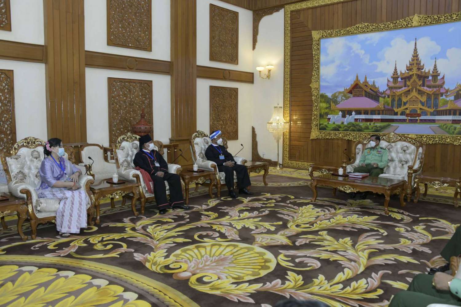 နိုင်ငံတော်စီမံအုပ်ချုပ်ရေးကောင်စီဥက္ကဋ္ဌ တပ်မတော်ကာကွယ်ရေးဦးစီးချုပ် ဗိုလ်ချုပ်မှူးကြီး မင်းအောင်လှိုင်သည် ပအိုဝ်းအမျိုးသားလွတ်မြောက်ရေးအဖွဲ့ချုပ် (PNLO)ဥက္ကဋ္ဌ ခွန်သူရိန်၊ လားဟူဒီမိုကရက်တစ်အစည်းအရုံး(LDU)ဥက္ကဋ္ဌ ကျောဆော်လမွန်နှင့် ရခိုင်ပြည် လွတ်မြောက်ရေးပါတီ (ALP) ဒုတိယဥက္ကဋ္ဌ စောမြရာဇာလင်းတို့ ဦးဆောင်သည့် ငြိမ်းချမ်းရေး ကိုယ်စားလှယ်အဖွဲ့အား ယနေ့နံနက်ပိုင်းတွင် နေပြည်တော်ရှိ ဘုရင့်နောင်ရိပ်သာ ဧည့်ခန်းမဆောင်၌ တွေ့ဆုံ၍ ငြိမ်းချမ်းရေးဆိုင်ရာ ကိစ္စရပ်များ ဆွေးနွေးသည်။