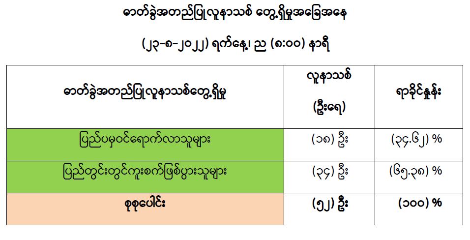 COVID-19 သံသယလူနာများ၊ ဓာတ်ခွဲအတည်ပြုလူနာနှင့် အနီးကပ်ထိတွေ့ခဲ့သူများနှင့် အသွားအလာကန့်သတ်ထားရှိသူများအား COVID-19 ရောဂါ ရှိ၊ မရှိ ဓာတ်ခွဲစစ်ဆေးခြင်း ပုံမှန်ဆောင်ရွက်လျက်ရှိပြီး (၂၂-၈-၂၀၂၂) ရက်နေ့၊ ည (၈:၀၀) နာရီမှ(၂၃-၈-၂၀၂၂) ရက်နေ့၊ ည (၈:၀၀) နာရီအတွင်း ဓာတ်ခွဲနမူနာစုစုပေါင်း (၈,၅၀၂)ခုအား စစ်ဆေးပြီးစီးခဲ့ရာ COVID-19 ရောဂါ ဓာတ်ခွဲအတည်ပြုလူနာသစ် (၅၂) ဦး တွေ့ရှိရပါသည်။ ထို့ကြောင့် ယနေ့အတွက် ရောဂါပိုးတွေ့ရှိမှုရာခိုင်နှုန်းမှာ (၀.၆၁) ရာခိုင်နှုန်း ရှိပါသည်။ ယနေ့တွေ့ရှိသော COVID-19 ရောဂါ ဓာတ်ခွဲအတည်ပြု လူနာသစ် (၅၂) ဦးအနက် (၁၈) ဦး၊ (၃၄.၆၂) ရာခိုင်နှုန်းမှာ ပြည်ပမှဝင်ရောက်လာသူများအား ဓာတ်ခွဲစစ်ဆေးရာမှ တွေ့ရှိခြင်းဖြစ်ပြီး (၃၄) ဦး၊ (၆၅.၃၈) ရာခိုင်နှုန်းမှာ ပြည်တွင်းတွင် ကူးစက်ဖြစ်ပွားသူများ ဖြစ်ပါသည်။