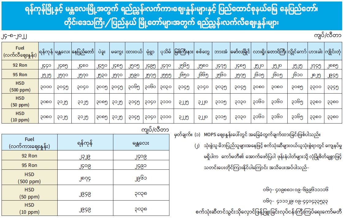 ရန်ကုန်မြို့နှင့် မန္တလေးမြို့အတွက် ရည်ညွှန်းလက်ကားဈေးနှုန်းများနှင့် ပြည်ထောင်စုနယ်မြေ နေပြည်တော်၊ တိုင်းဒေသကြီး/ပြည်နယ် မြို့တော်များအတွက် ရည်ညွှန်းလက်လီဈေးနှုန်းများ 08/24/2022
