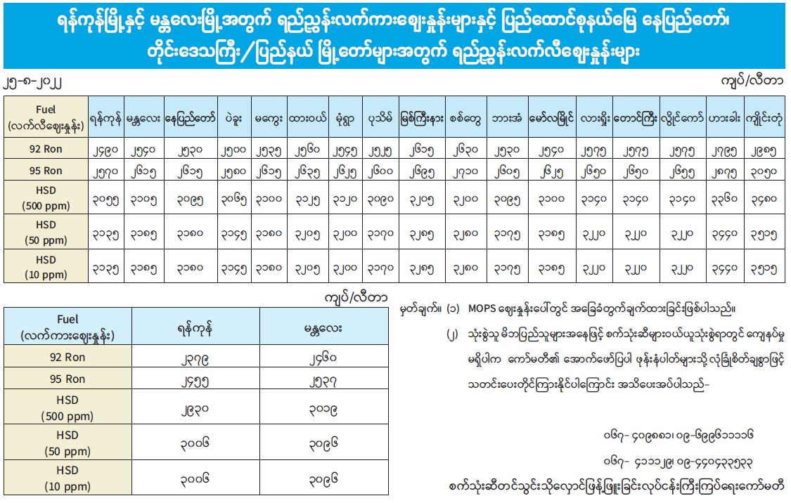 ရန်ကုန်မြို့နှင့် မန္တလေးမြို့အတွက် ရည်ညွှန်းလက်ကားဈေးနှုန်းများနှင့် ပြည်ထောင်စုနယ်မြေ နေပြည်တော်၊ တိုင်းဒေသကြီး/ပြည်နယ် မြို့တော်များအတွက် ရည်ညွှန်းလက်လီဈေးနှုန်းများ 08/25/2022