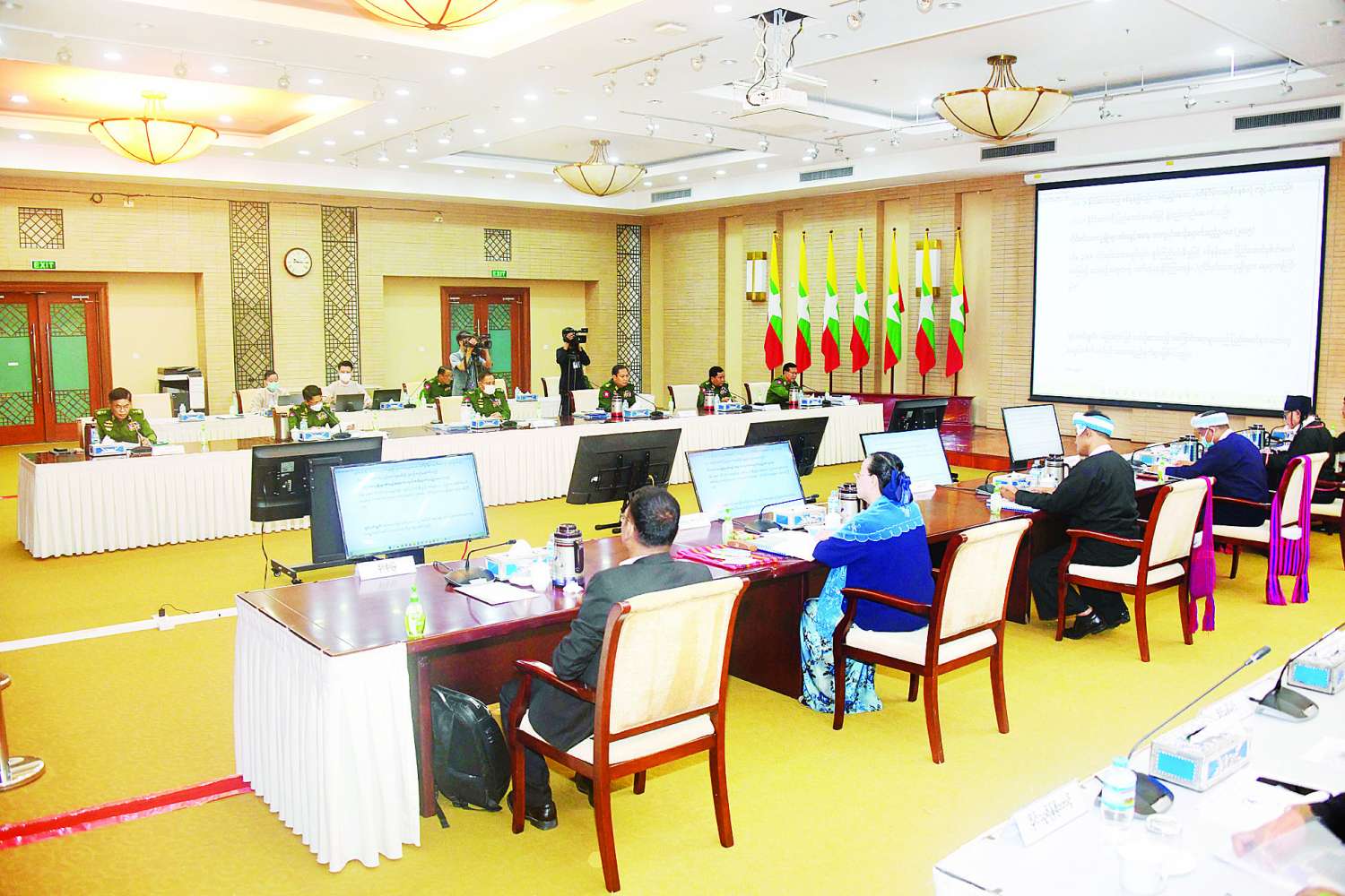 တတိယနေ့ဆွေးနွေးပွဲတွင် ပြည်ထောင်စုသဘောတူစာချုပ် အစိတ်အပိုင်း(၃)ပါ သဘောတူညီချက်များအား ပြည်ထောင်စုသမ္မတ မြန်မာနိုင်ငံတော် ဖွဲ့စည်းပုံအခြေခံဥပဒေ(၂၀၀၈ ခုနှစ်)၊ တည်ဆဲဥပဒေများနှင့် ကိုက်ညီမှု ရှိ/မရှိ လေ့လာ စိစစ်ချက်များနှင့် ဖွဲ့စည်းပုံအခြေခံဥပဒေ ဇယား ၁ ပြည်ထောင်စုဥပဒေပြုစာရင်းနှင့် ဇယား၂ တိုင်းဒေသကြီး သို့မဟုတ် ပြည်နယ်ဥပဒေပြု စာရင်းတို့နှင့်ပတ်သက်၍ ညှိနှိုင်းရေး ကော်မတီအဖွဲ့ဝင် ဒုတိယဗိုလ်ချုပ်ကြီး ဝင်းဗိုလ်ရှိန်က ကဏ္ဍအလိုက် ရှင်းလင်းတင်ပြပြီး (၉) ကြိမ်မြောက် JICM ဆုံးဖြတ်ချက်ပါ ဆက်လက် ညှိနှိုင်းဆွေးနွေးရမည့် ၂၀၂၀ အလွန် အဆင့်လိုက် လုပ်ငန်းစဉ်များနှင့် အဆင့်လိုက် အကောင်အထည်ဖော်မှုများ (ဇယား-၂)ကို ညှိနှိုင်းရေးကော်မတီဝင် ဒုတိယဗိုလ်ချုပ်ကြီးမင်းနောင်က ရှင်းလင်းတင်ပြသည်။
