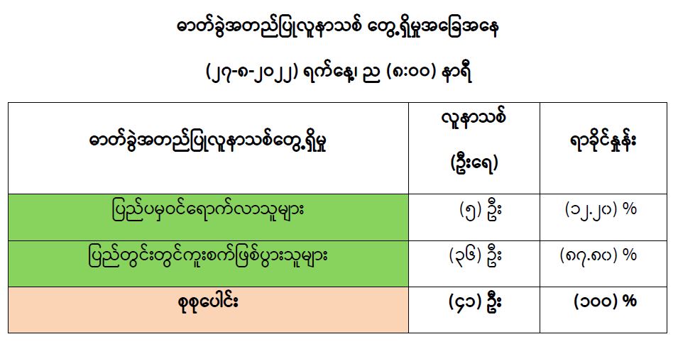 COVID-19 သံသယလူနာများ၊ ဓာတ်ခွဲအတည်ပြုလူနာနှင့် အနီးကပ်ထိတွေ့ခဲ့သူများနှင့် အသွားအလာကန့်သတ်ထားရှိသူများအား COVID-19 ရောဂါ ရှိ၊ မရှိ ဓာတ်ခွဲစစ်ဆေးခြင်း ပုံမှန် ဆောင်ရွက်လျက်ရှိပြီး (၂၆-၈-၂၀၂၂) ရက်နေ့၊ ည (၈:၀၀) နာရီမှ (၂၇-၈-၂၀၂၂) ရက်နေ့၊ ည (၈:၀၀) နာရီအတွင်း ဓာတ်ခွဲနမူနာစုစုပေါင်း (၆,၉၉၃) ခုအား စစ်ဆေးပြီးစီးခဲ့ရာ COVID-19 ရောဂါ ဓာတ်ခွဲအတည်ပြုလူနာသစ် (၄၁) ဦး တွေ့ရှိရပါသည်။ ထို့ကြောင့် ယနေ့အတွက် ရောဂါပိုးတွေ့ရှိမှု ရာခိုင်နှုန်းမှာ (၀.၅၉) ရာခိုင်နှုန်း ရှိပါသည်။ ယနေ့တွေ့ရှိသော COVID-19 ရောဂါ ဓာတ်ခွဲအတည်ပြု လူနာသစ် (၄၁) ဦးအနက် (၅) ဦး၊ (၁၂.၂၀) ရာခိုင်နှုန်းမှာ ပြည်ပမှဝင်ရောက်လာသူများအား ဓာတ်ခွဲ စစ်ဆေးရာမှ တွေ့ရှိခြင်းဖြစ်ပြီး (၃၆) ဦး၊ (၈၇.၈၀) ရာခိုင်နှုန်းမှာ ပြည်တွင်းတွင် ကူးစက် ဖြစ်ပွားသူများ ဖြစ်ပါသည်။