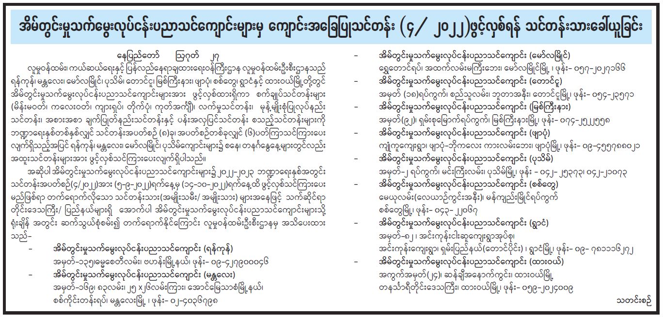 အိမ်တွင်းမှုအသက်မွေးလုပ်ငန်းပညာသင်တန်းကျောင်းများမှ ကျောင်းအခြေပြုသင်တန်း (၄/၂၀၂၂) ဖွင့်လှစ်ရန် သင်တန်းသားခေါ်ယူခြင်း 08/28/2022 အိမ်တွင်းမှုအသက်မွေးလုပ်ငန်းပညာသင်တန်းကျောင်းများမှ ကျောင်းအခြေပြုသင်တန်း (၄/၂၀၂၂) ဖွင့်လှစ်ရန် သင်တန်းသားခေါ်ယူခြင်း