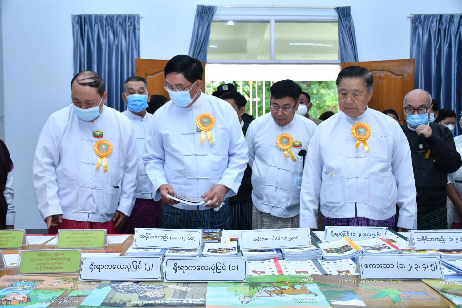 ထို့နောက် ပြည်ထောင်စုဝန်ကြီး၊ တိုင်းဒေသကြီးဝန်ကြီးချုပ်နှင့် ဧည့်သည်တော်များသည် ညွှန်ကြားရေးမှူးရုံး ရုံးအဆောက်အအုံသစ်နှင့် ရုံးအဆောက်အအုံ မြေညီထပ်တွင် ခင်းကျင်းပြသထားသည့် တိုင်းရင်းသားပုံပြပုံပြင်စာအုပ်များကို လှည့်လည်ကြည့်ရှုအားပေးသည်။