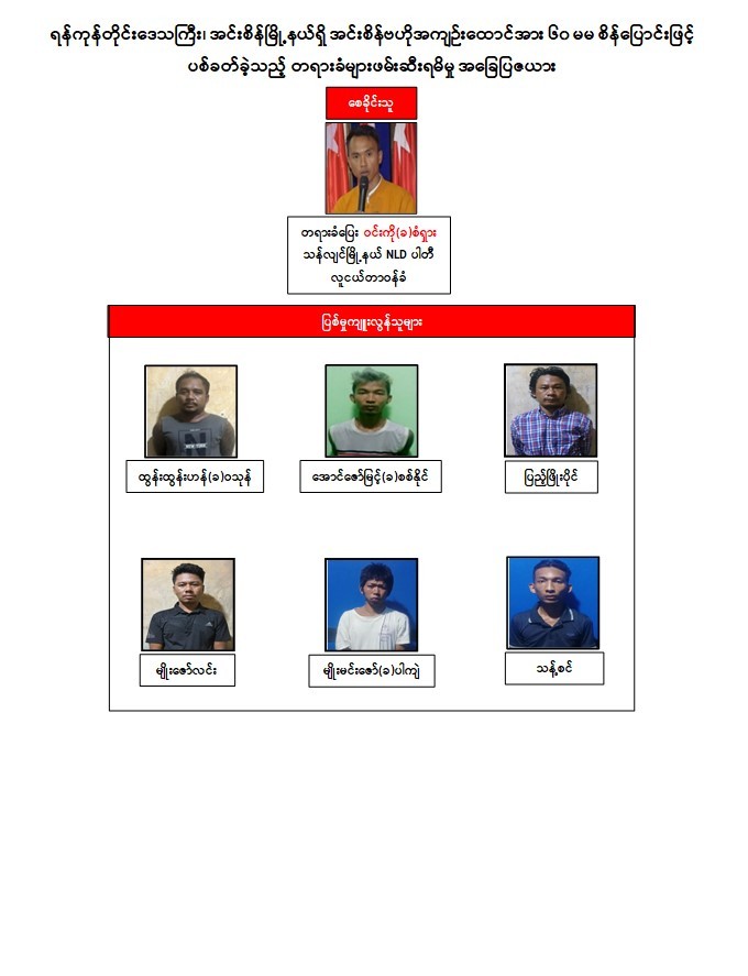 အထက်ပါဖြစ်စဉ်တွင် တရားခံကျား ၇ ဦး၊ မ ၁ ဦး၊ စုစုပေါင်း တရားခံ ၈ ဦး တို့အား ၆၀ မမစိန်ပြောင်း ၁ လက်နှင့်အတူ ဖမ်းဆီးရမိခဲ့သည်။