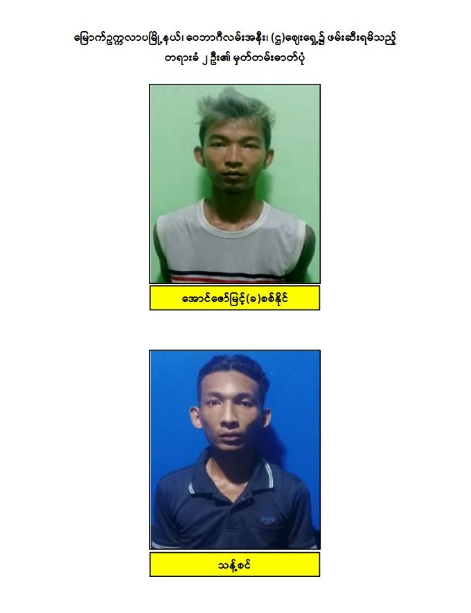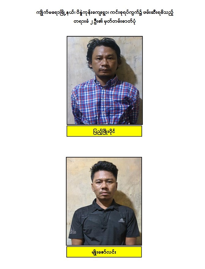 သို့ဖြစ်ပါ၍ ဖမ်းဆီးရမိတရားခံများအား ဥပဒေအရထိရောက်စွာ အရေးယူနိုင်ရေး ဆက်လက်ဆောင်ရွက်သွားမည်ဖြစ်ပြီး အကြမ်းဖက်မှု ဆောင်ရွက်နေသူများအား ပြည်သူ တစ်ရပ်လုံးက ဝိုင်းဝန်းကာကွယ်တိုက်ဖျက်ကြရန်နှင့် ပြစ်မှုကျူးလွန်ရာတွင် ပါဝင်ပတ်သက်သူများ၊ နောက်ကွယ်မှ ထောက်ပံ့ပေးလျက်ရှိသော ဆက်စပ်တရားခံများအား အမြန်ဆုံးဖမ်းဆီးရမိရေးအတွက် ၎င်းတို့ပုန်းခိုရာနေရာများ၊ လှုပ်ရှားသွားလာနေထိုင်မှု သတင်းများရရှိပါက သက်ဆိုင်ရာသို့ လျှို့ဝှက်စွာ သတင်းပေးတိုင်ကြားနိုင်ပါကြောင်း၊ သတင်းပေးသူနှင့် ဖမ်းဆီးပေးသူများအား ထိုက်တန်စွာလျှို့ဝှက်၍ ဆုငွေများချီးမြှင့် ပေးလျက်ရှိကြောင်းနှင့် မြို့ရွာများ အမြန်ဆုံး အေးချမ်းတည်ငြိမ်ရေးအတွက် ပြည်သူ တစ်ရပ်လုံး ပူးပေါင်းပါဝင်ကြိုးပမ်း ဆောင်ရွက်နိုင်ပါရန် မေတ္တာရပ်ခံအပ်ပါကြောင်း အသိပေး သတင်းထုတ်ပြန်အပ်ပါသည်။