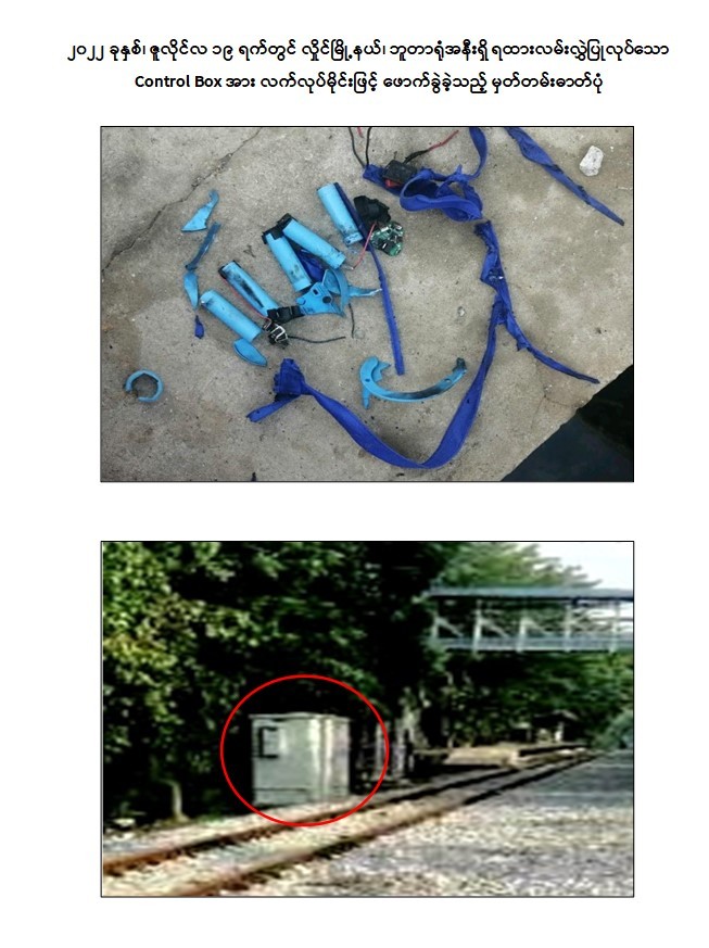 - ၂၀၂၂ ခုနှစ်၊ ဇူလိုင်လ ၁၉ ရက်တွင် လှိုင်မြို့နယ်၊ ဘူတာရုံအနီးရှိ ရထားလမ်းလွှဲပြုလုပ်သော Control Box အား လက်လုပ်မိုင်း ၂ လုံးဖြင့် ပစ်ခတ် ဖောက်ခွဲဖျက်ဆီးခဲ့ကြောင်း။