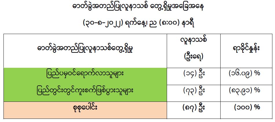 COVID-19 သံသယလူနာများ၊ ဓာတ်ခွဲအတည်ပြုလူနာနှင့် အနီးကပ်ထိတွေ့ခဲ့သူများနှင့် အသွားအလာကန့်သတ်ထားရှိသူများအား COVID-19 ရောဂါ ရှိ၊ မရှိ ဓာတ်ခွဲစစ်ဆေးခြင်း ပုံမှန် ဆောင်ရွက်လျက်ရှိပြီး (၂၉-၈-၂၀၂၂) ရက်နေ့၊ ည (၈:၀၀) နာရီမှ (၃၀-၈-၂၀၂၂) ရက်နေ့၊ ည (၈:၀၀) နာရီအတွင်း ဓာတ်ခွဲနမူနာစုစုပေါင်း (၈,၉၀၂) ခုအား စစ်ဆေးပြီးစီးခဲ့ရာ COVID-19 ရောဂါ ဓာတ်ခွဲအတည်ပြုလူနာသစ် (၈၇) ဦး တွေ့ရှိရပါသည်။ ထို့ကြောင့် ယနေ့အတွက် ရောဂါပိုးတွေ့ရှိမှု ရာခိုင်နှုန်းမှာ (၀.၉၈) ရာခိုင်နှုန်း ရှိပါသည်။ ယနေ့တွေ့ရှိသော COVID-19 ရောဂါ ဓာတ်ခွဲအတည်ပြု လူနာသစ် (၈၇) ဦးအနက် (၁၄) ဦး၊ (၁၆.၀၉) ရာခိုင်နှုန်းမှာ ပြည်ပမှဝင်ရောက်လာသူများအား ဓာတ်ခွဲစစ်ဆေးရာမှ တွေ့ရှိခြင်းဖြစ်ပြီး (၇၃) ဦး၊ (၈၃.၉၁) ရာခိုင်နှုန်းမှာ ပြည်တွင်းတွင် ကူးစက်ဖြစ်ပွားသူများ ဖြစ်ပါသည်။