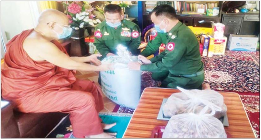 ထိုသို့ဆောင်ရွက်လျက်ရှိရာ ယနေ့တွင် ရန်ကုန်တိုင်းဒေသကြီး မင်္ဂလာဒုံမြို့နယ် ကြံခင်းစုရပ်ကွက်ရှိ ပဇ္ဇောတာရာမကျောင်းတိုက်၊ ဒိုက်ဦးကျောင်းတိုက်၊ ပွင့်ဦးကျောင်းတိုက်၊ ဘဝမ်းကျောင်းတိုက်နှင့် ပညာတံခွန်ကျောင်းတိုက်၊ မှော်ဘီမြို့နယ် မြိုင်သာယာကျေးရွာရှိ သာသနာ့ဗိမာန်ကျောင်းတိုက်၊ ဧရာဝတီတိုင်းဒေသကြီး ပုသိမ်မြို့ရှိ ကုန်းသာကျောင်းတိုက်၊ ဟင်္သာတမြို့ရှိ မြသိင်္ဂီစာသင်တိုက်၊ မင်္ဂလာရာမသီလရှင်စာသင်တိုက်၊ ရတနာမွန်သီလရှင်စာသင်တိုက်၊ အပြင်ပတ္တမြားသီလရှင် စာသင်တိုက်နှင့် ရေတံခွန်သီလရှင်စာသင်တိုက်၊ စစ်ကိုင်းတိုင်းဒေသကြီး ခန္တီးမြို့ သာစည်ရပ်ကွက်ရှိ သာသနာဓမ္မသုခကျောင်းတိုက်နှင့် မန္တလေးတိုင်းဒေသကြီး ပုသိမ်ကြီးမြို့နယ် ရန်ကင်းတောင်ခြေရှိ ချမ်းမြရံသီပရိယတ္တိ စာသင်တိုက်၊ ပျော်ဘွယ်မြို့နယ် ရန်အောင်ကျေးရွာရှိ ဇေယျုတောင်တောရ ဘုန်းတော်ကြီးကျောင်း၊ မိတ္ထီလာမြို့နယ် မြှာကျေးရွာအုပ်စု ရဝေကျေးရွာရှိ တပ်ဦးတောရ ဘုန်းတော်ကြီးကျောင်း၊ ကျောင်းရွာတောရ ဘုန်းတော်ကြီးကျောင်း၊ သာစည်မြို့နယ် ယင်းမာပင်ကျေးရွာရှိ လုမ္ပနီသစ်တစ်ပင် တောင်ပေါ်ကျောင်းတို့မှ သံဃာတော်များနှင့် သာသနာ့နွယ်ဝင် သီလရှင်များအား ဆွမ်းဆန်တော်၊ ဆီ၊ ဆား၊ ပဲ အမယ်(၄)မျိုး၊ နဝကမ္မအလှူငွေများ၊ ကိုဗစ်-၁၉ ရောဂါကာကွယ်ရေး အထောက်အကူပြုပစ္စည်းများ၊ နေ့ဆွမ်းများနှင့် လှူဖွယ်ပစ္စည်းများကို တိုင်းစစ်ဌာနချုပ်အသီးသီးမှ တိုင်းမှူးများနှင့် တာဝန်ရှိသူများက သွားရောက်ဆက်ကပ်လှူဒါန်းခဲ့ကြပြီး နယ်မြေခံဆေးအဖွဲ့များက လိုအပ်သည့် ကျန်းမာရေး စစ်ဆေးကုသပေးခြင်းများ ဆောင်ရွက်ပေးခဲ့ကြောင်း သတင်းရရှိသည်။