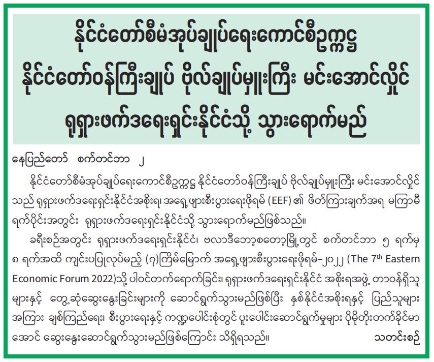 နိုင်ငံတော်စီမံအုပ်ချုပ်ရေးကောင်စီဥက္ကဋ္ဌ နိုင်ငံတော်ဝန်ကြီးချုပ် ဗိုလ်ချုပ်မှူးကြီး မင်းအောင်လှိုင် ရုရှားဖက်ဒရေးရှင်းနိုင်ငံသို့ သွားရောက်မည် 09/03/2022 နိုင်ငံတော်စီမံအုပ်ချုပ်ရေးကောင်စီဥက္ကဋ္ဌ နိုင်ငံတော်ဝန်ကြီးချုပ် ဗိုလ်ချုပ်မှူးကြီး မင်းအောင်လှိုင် ရုရှားဖက်ဒရေးရှင်းနိုင်ငံသို့ သွားရောက်မည်