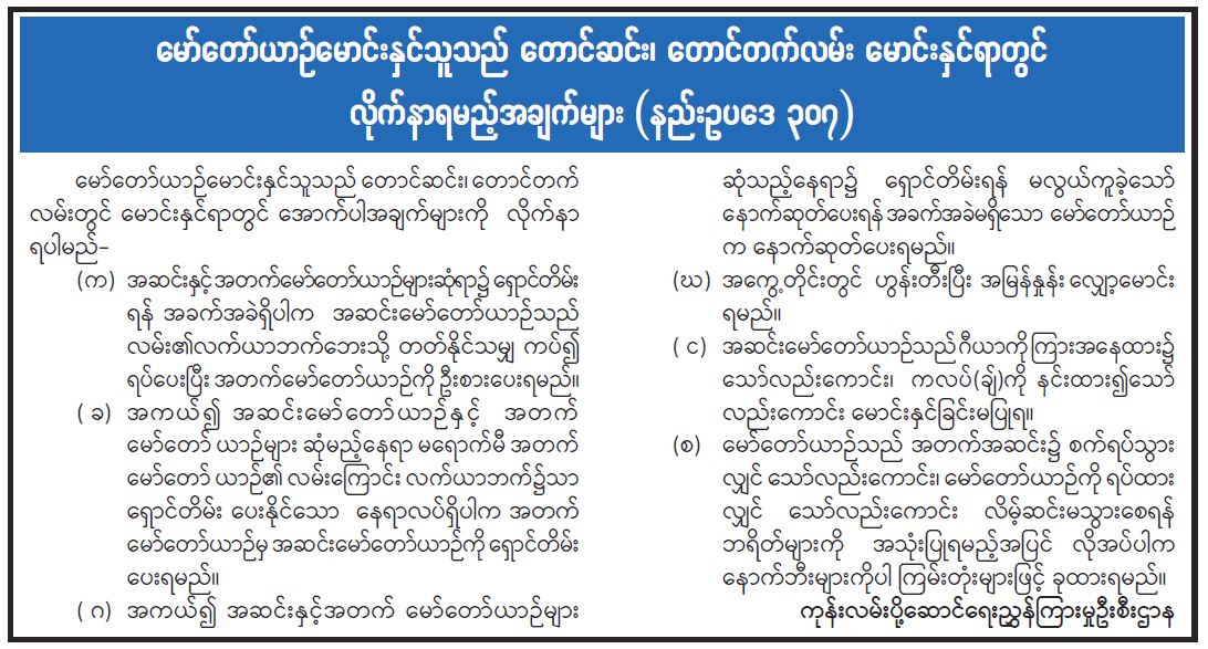 မော်တော်ယာဉ်မောင်းနှင်သူသည် တောင်ဆင်း၊ တောင်တက်လမ်း မောင်းနှင်ရာတွင် လိုက်နာရမည့်အချက်များ (နည်းဥပဒေ ၃၀၇) 09/03/2022 မော်တော်ယာဉ်မောင်းနှင်သူသည် တောင်ဆင်း၊ တောင်တက်လမ်း မောင်းနှင်ရာတွင် လိုက်နာရမည့်အချက်များ (နည်းဥပဒေ ၃၀၇)