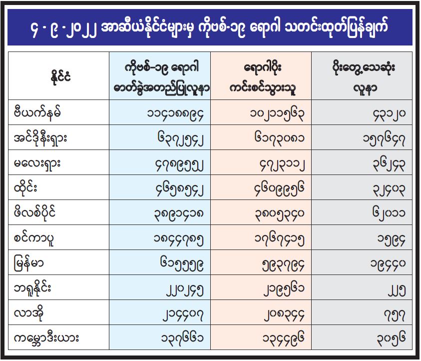၄-၉-၂၀၂၂ အာဆီယံနိုင်ငံများမှ ကိုဗစ်-၁၉ ရောဂါ သတင်းထုတ်ပြန်ချက်