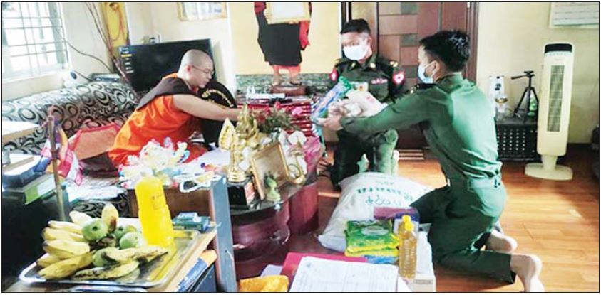 ထိုသို့ ဆောင်ရွက်လျက်ရှိရာ ယနေ့တွင် ရန်ကုန်တိုင်းဒေသကြီး မှော်ဘီမြို့နယ် ရေပြာကျေးရွာရှိ ရွှေတွံတေးဓမ္မရိပ်သာကျောင်းတိုက်၊ ဧရာဝတီတိုင်းဒေသကြီး ဟိုင်းကြီးကျွန်းမြို့ရှိ စိတ္တသုခကျောင်းတိုက် မန္တလေးတိုင်းဒေသကြီး သပိတ်ကျင်းမြို့နယ် ကျောက်လှည်းဘီးကျေးရွာရှိ သာဓုကာရီဘုန်းတော်ကြီးကျောင်း၊ အုန်းတကူကျေးရွာရှိ အောင်သိဒ္ဓိဘုန်းတော်ကြီးကျောင်းနှင့် မကွေးတိုင်းဒေသကြီး တောင်တွင်းကြီးမြို့ရှိ ပညာရောင်ခြည် သီလရှင်စာသင်တိုက်တို့မှ သံဃာတော်များနှင့် သာသနာ့နွယ်ဝင် သီလရှင်များအား ဆွမ်းဆန်တော်၊ ဆီ၊ ဆား၊ ပဲ အမယ်လေးမျိုး၊ နဝကမ္မအလှူငွေများ၊ ကိုဗစ်-၁၉ ရောဂါ ကာကွယ်ရေး အထောက်အကူပြုပစ္စည်းများ၊ နေ့ဆွမ်းများနှင့် လှူဖွယ်ပစ္စည်းများကို သက်ဆိုင်ရာတိုင်းစစ်ဌာနချုပ်များမှ တာဝန်ရှိသူများက သွားရောက်ဆက်ကပ်လှူဒါန်းကြပြီး နယ်မြေခံဆေးအဖွဲ့များက လိုအပ်သည့် ကျန်းမာရေး စစ်ဆေးကုသပေးခြင်းများ ဆောင်ရွက်ပေးခဲ့ကြောင်း သတင်းရရှိသည်။