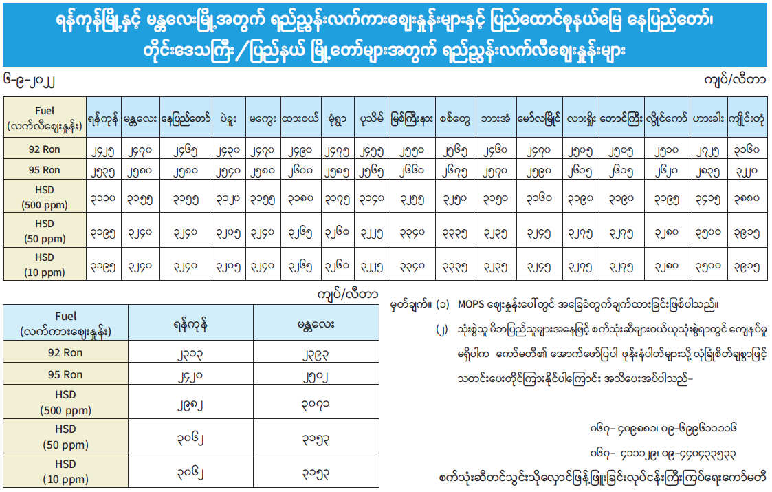 ရန်ကုန်မြို့နှင့် မန္တလေးမြို့အတွက် ရည်ညွှန်း လက်ကား ဈေးနှုန်းများနှင့် ပြည်ထောင်စုနယ်မြေ နေပြည်တော်၊ တိုင်းဒေသကြီး/ ပြည်နယ် မြို့တော်များအတွက် ရည်ညွှန်း လက်လီဈေးနှုန်းများ