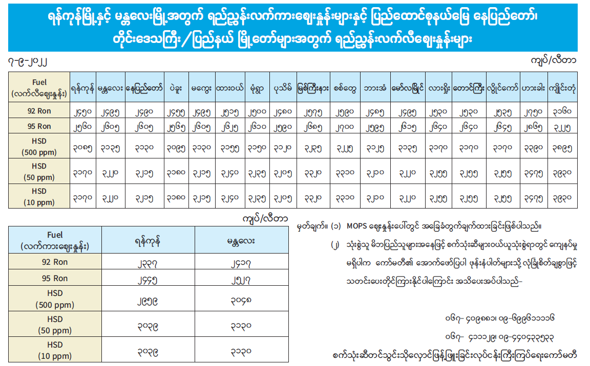 ရန်ကုန်မြို့နှင့် မန္တလေးမြို့အတွက် ရည်ညွှန်းလက်ကား ဈေးနှုန်းများနှင့် ပြည်ထောင်စုနယ်မြေ နေပြည်တော်၊ တိုင်းဒေသကြီး/ ပြည်နယ် မြို့တော်များအတွက် ရည်ညွှန်း လက်လီဈေးနှုန်းများ 09/07/2022