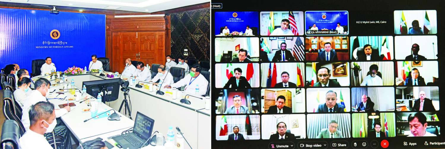 နိုင်ငံခြားရေးဝန်ကြီးဌာန ပြည်ထောင်စုဝန်ကြီး ဦးဝဏ္ဏမောင်လွင်၊ အပြည်ပြည်ဆိုင်ရာ ပူးပေါင်းဆောင်ရွက်ရေးဝန်ကြီးဌာန ပြည်ထောင်စုဝန်ကြီး ဦးကိုကိုလှိုင်တို့သည် နိုင်ငံတော်စီမံအုပ်ချုပ်ရေးကောင်စီဥက္ကဋ္ဌ နိုင်ငံတော်ဝန်ကြီးချုပ်၏ လမ်းညွှန်မှာကြားချက်များနှင့် ပတ်သက်၍ ပြည်ပနိုင်ငံများတွင် တာဝန်ထမ်းဆောင်လျက်ရှိကြသော သံအမတ်ကြီးများ၊ အမြဲတမ်း ကိုယ်စားလှယ်များ၊ ကောင်စစ်ဝန်ချုပ်များနှင့် သံရုံးယာယီတာဝန်ခံများအား ထပ်ဆင့်ရှင်းလင်းပွဲကို ယနေ့ ညနေ ၄ နာရီတွင် Video Conferencing စနစ်ဖြင့် နိုင်ငံခြားရေးဝန်ကြီးဌာန ဧရာဝတီခန်းမ၌ ကျင်းပပြုလုပ်သည်။