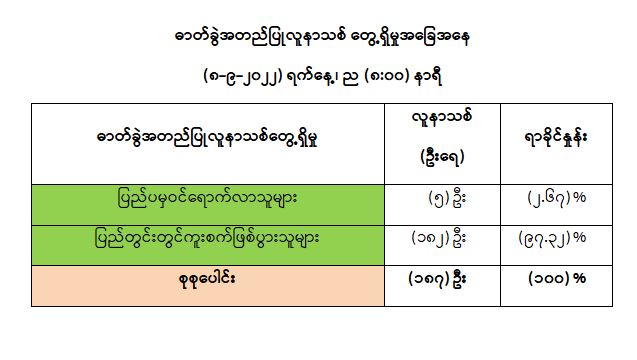 ဓာတ်ခွဲအတည်ပြုလူနာများအား နေအိမ်တွင် သီးခြားထားရှိခြင်းနှင့် ဆေးရုံများတွင် သီးခြား ထားရှိကုသမှုပေးခြင်းများ ဆောင်ရွက်ခဲ့ရာ ယနေ့တွင် ပြန်လည်ကောင်းမွန်လာသူ (၈၈) ဦးရှိသဖြင့် ယနေ့အထိ ပြန်လည်ကောင်းမွန်လာသူ စုစုပေါင်း (၅၉၄,၀၇၁) ဦး ရှိပြီဖြစ်ပါသည်။ ယနေ့တွင် COVID-19 ရောဂါဖြင့် သေဆုံးသူ မရှိပါသဖြင့် ယနေ့အထိ သေဆုံးသူစုစုပေါင်း (၁၉,၄၄၂) ဦးရှိပါ သည်။