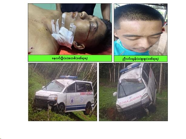 ဖြစ်စဉ်မှာ ရေးမြို့၊ အောင်မင်္ဂလာရပ်ကွက်နေသူများဖြစ်သည့် မောင်နေလင်းဦး (ခ) အဘစ် (၂၀) နှစ် မောင်းနှင်ပြီး အကူယာဉ်မောင်းအဖြစ် မောင်ညီလင်းထွန်း (ခ) ဇူးဇူး (၁၉) နှစ်တို့ ၂ ဦးသည် အောင်မင်္ဂလာလူမှုကူညီရေးယာဉ်ဖြင့် မော်လမြိုင်မြို့ပြည်သူ့ဆေးရုံကြီးသို့ လူနာသွားရောက်ပို့ဆောင်ပြီး ရေးမြို့သို့ပြန်လည် ထွက်ခွာလာခဲ့ရာ ယနေ့နံနက် ၁ နာရီခွဲအချိန်ခန့် သံဖြူဇရပ်မြို့နယ်၊ ပိန္နဲတောကျေးရွာအနီးအရောက်၌ PDF အမည်ခံ အကြမ်းဖက်သမားများက လမ်း၏ယာဘက်မှ မိုင်းဖြင့်ဖောက်ခွဲတိုက်ခိုက်ခဲ့သဖြင့် လူမှုကူညီရေးယာဉ်မှာ လမ်း၏ယာဘက်မြေသားပေါ်သို့ ရောက်ရှိရပ်တန့်ခဲ့ပြီး ယာဉ်၏ဦးခေါင်းပိုင်းပျက်စီးကာ ယာဉ်မောင်းမောင်နေလင်းဦး(ခ) အဘစ်တွင် လည်ပင်းမိုင်းစ ဖောက်ဝင်ဒဏ်ရာတစ်ချက်၊ ဝဲမျက်ခုံးကွဲ၊ ဦးခေါင်းနောက်စေ့ပေါက်ပြဲ ဒဏ်ရာများနှင့် မောင်ညီလင်းထွန်း(ခ) ဇူးဇူးတွင် နဖူးယာဘက်ဖူးရောင်ဒဏ်ရာများ ရရှိခဲ့သဖြင့် ဆေးကုသမှု ခံယူလျက်ရှိသည်။