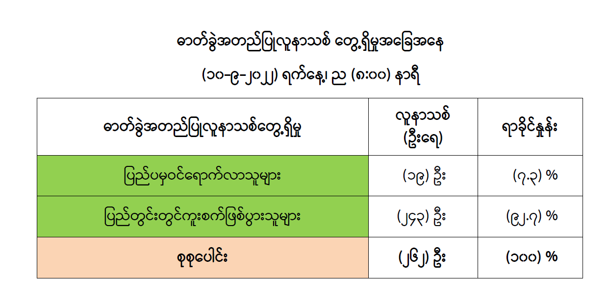 COVID-19 သံသယလူနာများ၊ ဓာတ်ခွဲအတည်ပြုလူနာနှင့် အနီးကပ်ထိတွေ့ခဲ့သူများနှင့် အသွားအလာ ကန့်သတ်ထားရှိသူများအား COVID-19 ရောဂါ ရှိ၊ မရှိ ဓာတ်ခွဲစစ်ဆေးခြင်း ပုံမှန်ဆောင်ရွက်လျက်ရှိပြီး (၉-၉-၂၀၂၂) ရက်နေ့၊ ည (၈:၀၀) နာရီမှ (၁၀-၉-၂၀၂၂) ရက်နေ့၊ ည (၈:၀၀) နာရီအတွင်း ဓာတ်ခွဲနမူနာစုစုပေါင်း (၁၀,၈၀၄) ခုအား စစ်ဆေးပြီးစီးခဲ့ရာ COVID-19 ရောဂါ ဓာတ်ခွဲအတည်ပြုလူနာသစ် (၂၆၂) ဦး တွေ့ရှိရပါသည်။ ထို့ကြောင့် ယနေ့အတွက် ရောဂါပိုးတွေ့ရှိမှု ရာခိုင်နှုန်းမှာ (၂.၄၃) ရာခိုင်နှုန်း ရှိပါသည်။ ယနေ့ တွေ့ရှိသော COVID-19 ရောဂါ ဓာတ်ခွဲအတည်ပြုလူနာသစ် (၂၆၂) ဦးအနက် (၁၉) ဦး၊ (၇.၃) ရာခိုင်နှုန်းမှာ ပြည်ပမှဝင်ရောက်လာသူများအား ဓာတ်ခွဲစစ်ဆေးရာမှ တွေ့ရှိခြင်းဖြစ်ပြီး (၂၄၃) ဦး၊ (၉၂.၇) ရာခိုင်နှုန်းမှာ ပြည်တွင်းတွင် ကူးစက်ဖြစ်ပွားသူများ ဖြစ်ပါသည်။ သို့ဖြစ်ပါ၍ ယနေ့အထိ ဓာတ်ခွဲနမူနာစုစုပေါင်း (၈,၈၃၄,၈၈၇) ခုအား စစ်ဆေးခဲ့ပြီး COVID-19 ဓာတ်ခွဲအတည်ပြုလူနာ စုစုပေါင်း (၆၁၆,၆၆၃) ဦး ရှိပြီ ဖြစ်ပါသည်။