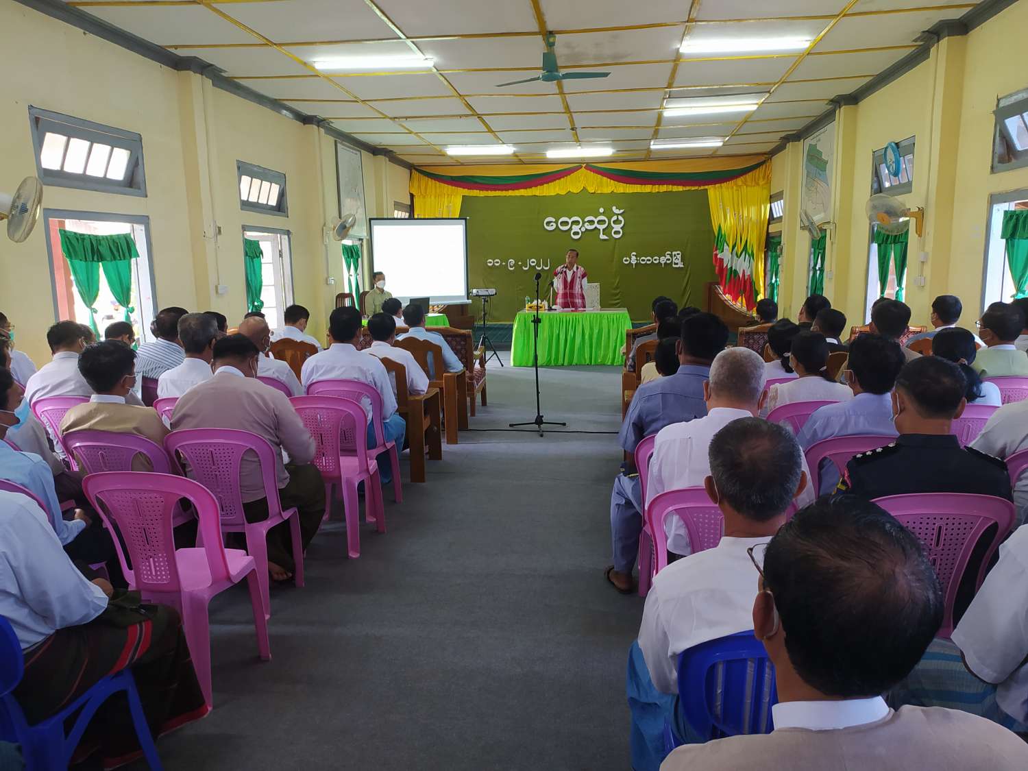 နိုင်ငံတော်စီမံအုပ်ချုပ်ရေးကောင်စီအဖွဲ့ဝင် မန်းငြိမ်းမောင်နှင့် ဧရာဝတီတိုင်းဒေသကြီး ပန်းတနော်မြို့ မြို့နယ်စီမံအုပ်ချုပ်ရေးအဖွဲ့ဝင်များ၊ မြို့နယ်အဆင့် ဌာနဆိုင်ရာအကြီးအကဲများ၊ ရပ်ကွက်၊ ကျေးရွာအုပ်ချုပ်ရေးမှူးများနှင့် မြို့မိမြို့ဖများ တွေ့ဆုံပွဲအခမ်းအနားကို ယနေ့နံနက် ၉ နာရီခွဲက အထွေထွေအုပ်ချုပ်ရေးဦးစီးဌာန အစည်းအဝေးခန်းမ၌ ကျင်းပသည်။