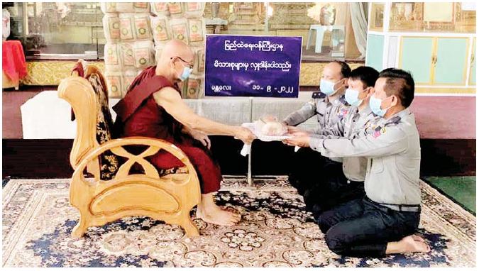 ပြည်ထဲရေးဝန်ကြီးဌာန တပ်ဖွဲ့ဝင်/ဝန်ထမ်း အရာထမ်း၊ အမှုထမ်းမိသားစုများက မြို့နယ်အသီးသီးရှိ ဘုန်းတော်ကြီးကျောင်းများသို့ ဆွမ်းဆန်တော်နှင့် ဆန်ကြာဆံများ ဆက်ကပ်လှူဒါန်းခြင်းကို ဆောင်ရွက်လျက်ရှိသည်။