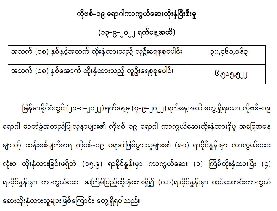 COVID-19 ရောဂါ ကာကွယ်ထိန်းချုပ်ရေးအတွက် တိုင်းဒေသကြီး/ပြည်နယ်များတွင် COVID-19 ရောဂါကာကွယ်ဆေးကို ဦးတည်အုပ်စုများသတ်မှတ်၍ ထိုးနှံပေးလျက်ရှိရာ (၁၃-၉-၂၀၂၂) ရက်နေ့အထိ အသက် (၁၈) နှစ်နှင့်အထက် လူဦးရေစုစုပေါင်း (၃၀,၄၆၁,၀၆၃) ဦးနှင့် အသက် (၁၈) နှစ်အောက် လူဦးရေစုစုပေါင်း (၆,၅၁၅,၅၂၂) ဦးတို့အား ထိုးနှံထားရှိပြီး ဖြစ်ပါသည်။