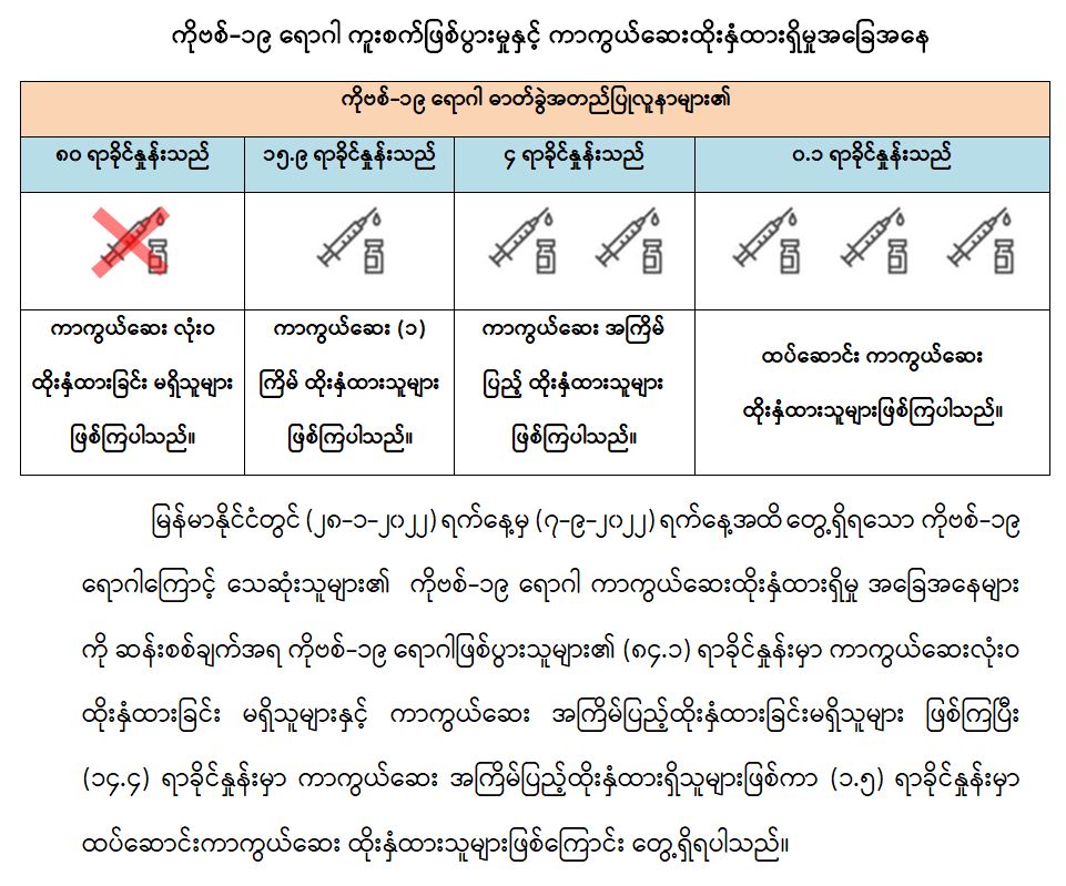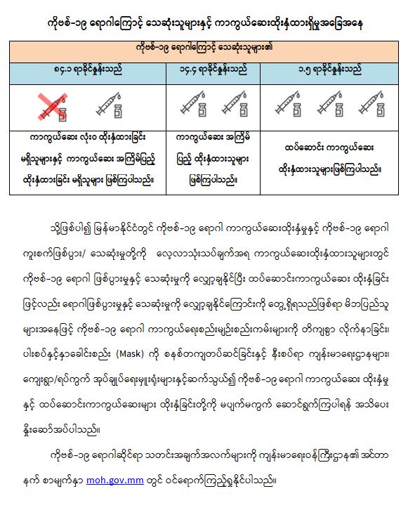 ကျန်းမာရေးဝန်ကြီးဌာနအနေဖြင့် နိုင်ငံအတွင်း ကူးစက်ဖြစ်ပွားနေသော COVID-19 ရောဂါ ကာကွယ်၊ ကုသ၊ ထိန်းချုပ်ရေးလုပ်ငန်းများကို အရှိန်အဟုန်မပြတ် ဆောင်ရွက်လျက်ရှိရာ ရောဂါထိန်းချုပ်ရေးလုပ်ငန်းများ အောင်မြင်နိုင်ရေးအတွက် ပြည်သူလူထုအနေဖြင့် ကျန်းမာရေးဝန်ကြီးဌာနမှ ထုတ်ပြန်ထားသော COVID-19 ရောဂါကာကွယ်ထိန်းချုပ်ရေးဆိုင်ရာ စည်းကမ်းများကို စနစ်တကျ လိုက်နာဆောင်ရွက်ရန်လိုအပ်ပြီး COVID-19 ကာကွယ်ဆေးထိုးနှံမှု ခံယူခြင်းအား အထူးဂရုပြု ပူးပေါင်းဆောင်ရွက်ကြရန် လိုအပ်ပါသည်။