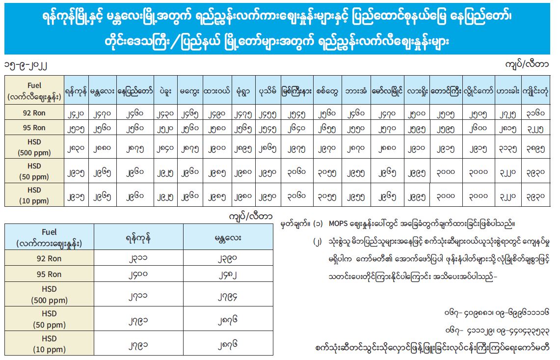ရန်ကုန်မြို့နှင့် မန္တလေးမြို့တို့အတွက် ရည်ညွှန်းလက်ကားစျေးနှုန်းများနှင့် ပြည်ထောင်စုနယ်မြေ နေပြည်တော်၊ တိုင်းဒေသကြီး/ပြည်နယ် မြို့တော်များအတွက် ရည်ညွှန်းလက်လီစျေးနှုန်းများ