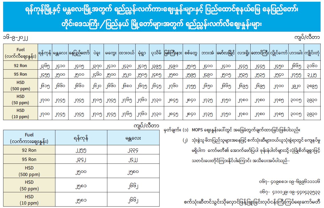 ရန်ကုန်မြို့နှင့် မန္တလေးမြို့တို့အတွက် ရည်ညွှန်းလက်ကားစျေးနှုန်းများနှင့် ပြည်ထောင်စုနယ်မြေ နေပြည်တော်၊ တိုင်းဒေသကြီး/ပြည်နယ် မြို့တော်များအတွက် ရည်ညွှန်းလက်လီစျေးနှုန်းများ 09/16/2022