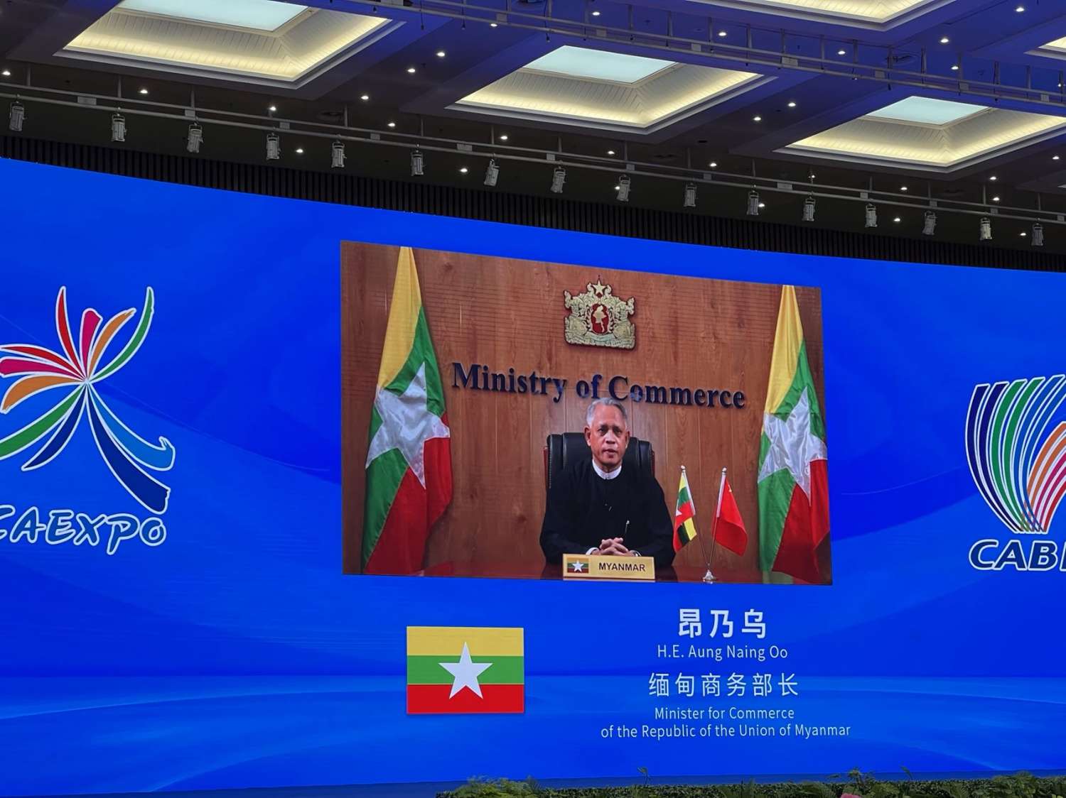 (၁၉) ကြိမ်မြောက် တရုတ်-အာဆီယံ ကုန်စည်ပြပွဲနှင့် စီပွားရေးနှင့် ရင်းနှီးမြှုပ်နှံမှုပွဲတော် ဖွင့်ပွဲအခမ်းအနားကို တရုတ်ပြည်သူ့သမ္မတနိုင်ငံ၊ ကွမ်ရှီးကျွမ့် ကိုယ်ပိုင်အုပ်ချုပ်ခွင့်ရဒေသ၊ နန်နင်းမြို့ရှိ Nanning International Exhibition and Convention Center ၌ ယနေ့တွင် Hybrid စနစ်ဖြင့် ကျင်းပရာ စီးပွားရေးနှင့်ကူးသန်းရောင်းဝယ်ရေးဝန်ကြီးဌာန၊ ပြည်ထောင်စု ဝန်ကြီး ဦးအောင်နိုင်ဦးက ဗီဒီယိုအမှာစကား ပေးပို့ပြောကြားသည်။