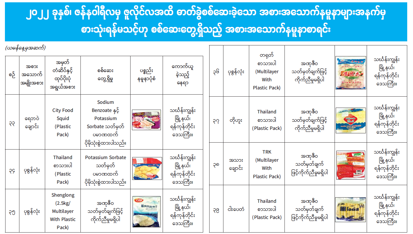 ၂၀၂၂ ခုနှစ်၊ ဇန်နဝါရီလမှ ဇူလိုင်လအထိ ဓာတ်ခွဲစစ်ဆေးခဲ့သော အစားအသောက် နမူနာများအနက်မှ စားသုံးရန်မသင့်ဟု စစ်ဆေးတွေ့ရှိသည့် အစားအသောက်နမူနာစာရင်း 09/17/2022