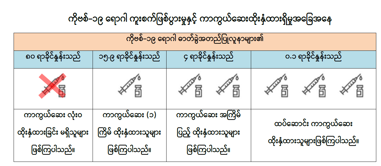 မြန်မာနိုင်ငံတွင် (၂၈-၁-၂၀၂၂) ရက်နေ့မှ (၇-၉-၂၀၂၂) ရက်နေ့အထိ တွေ့ရှိရသော ကိုဗစ်-၁၉ ရောဂါကြောင့် သေဆုံးသူများ၏ ကိုဗစ်-၁၉ ရောဂါ ကာကွယ်ဆေးထိုးနှံထားရှိမှု အခြေအနေများကို ဆန်းစစ်ချက်အရ ကိုဗစ်-၁၉ ရောဂါဖြစ်ပွားသူများ၏ (၈၄.၁) ရာခိုင်နှုန်းမှာ ကာကွယ်ဆေး လုံးဝထိုးနှံထားခြင်း မရှိသူများနှင့် ကာကွယ်ဆေးအကြိမ်ပြည့် ထိုးနှံထားခြင်းမရှိသူများဖြစ်ကြပြီး (၁၄.၄) ရာခိုင်နှုန်းမှာ ကာကွယ်ဆေးအကြိမ်ပြည့် ထိုးနှံထားရှိသူများဖြစ်ကာ (၁.၅) ရာခိုင်နှုန်းမှာ ထပ်ဆောင်းကာကွယ်ဆေး ထိုးနှံထားသူများဖြစ်ကြောင်း တွေ့ရှိရပါသည်။ သို့ဖြစ်ပါ၍ မြန်မာနိုင်ငံတွင် ကိုဗစ်-၁၉ ရောဂါ ကာကွယ်ဆေးထိုးနှံမှုနှင့် ကိုဗစ်-၁၉ ရောဂါ ကူးစက်ဖြစ်ပွား/ သေဆုံးမှုတို့ကို လေ့လာသုံးသပ်ချက်အရ ကာကွယ်ဆေးထိုးနှံထားသူများတွင် ကိုဗစ်-၁၉ ရောဂါ ဖြစ်ပွားမှုနှင့် သေဆုံးမှုကို လျှော့ချနိုင်ပြီး ထပ်ဆောင်းကာကွယ်ဆေး ထိုးနှံခြင်းဖြင့်လည်း ရောဂါဖြစ်ပွားမှုနှင့် သေဆုံးမှုကို လျှော့ချနိုင်ကြောင်းကို တွေ့ရှိရသည်ဖြစ်ရာ မိဘပြည်သူများအနေဖြင့် ကိုဗစ်-၁၉ ရောဂါကာကွယ်ရေး စည်းမျဉ်း စည်းကမ်းများကို တိကျစွာလိုက်နာခြင်း၊ ပါးစပ်နှင့်နှာခေါင်းစည်း (Mask)ကို စနစ်တကျ တပ်ဆင်ခြင်းနှင့် နီးစပ်ရာ ကျန်းမာရေးဌာနများ၊ ကျေးရွာ/ရပ်ကွက် အုပ်ချုပ်ရေးမှူးရုံးများနှင့် ဆက်သွယ်၍ ကိုဗစ်-၁၉ ရောဂါကာကွယ်ဆေး ထိုးနှံမှုနှင့် ထပ်ဆောင်းကာကွယ်ဆေးများ ထိုးနှံခြင်းတို့ကို မပျက်မကွက် ဆောင်ရွက်ကြပါရန် အသိပေး နှိုးဆော်အပ်ပါသည်။
