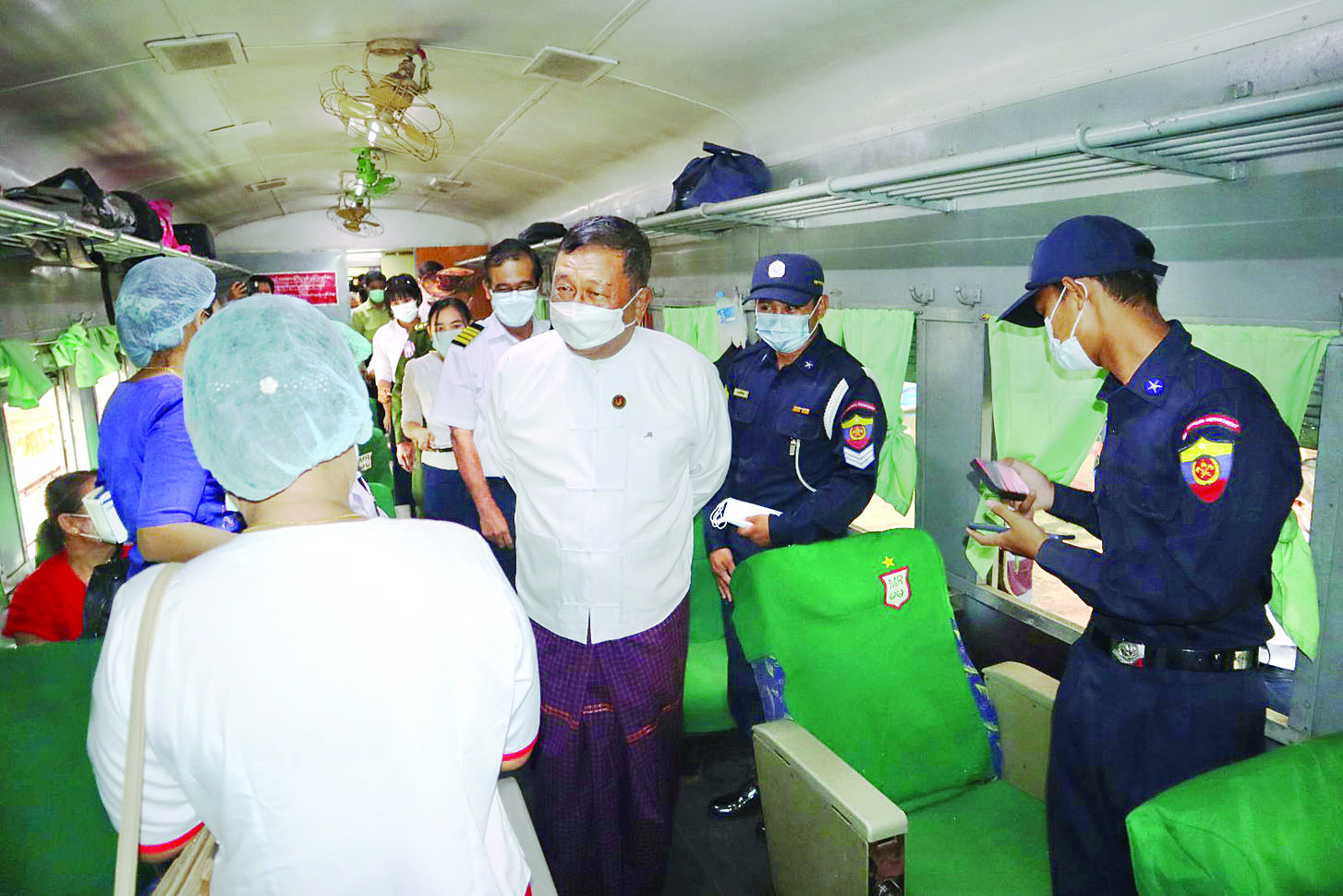 ထို့နောက် ပြည်နယ်ဝန်ကြီးချုပ်သည် မြန်မာ့မီးရထား (ပို့ဆောင်ရေး၊တိုင်းအမှတ်-၈)မှ တာဝန်ရှိသူများနှင့် တွေ့ဆုံကာ ခရီးသွားပြည်သူများ အဆင်ပြေချောမွေ့စွာ ခရီးသွားလာနိုင်ရေး၊ ဘူတာရုံများတွင် ကိုဗစ်-၁၉ ရောဂါဆိုင်ရာ စည်းကမ်းချက်များနှင့်အညီ လိုက်နာကြစေရေး၊ ဘူတာရုံပရိဝုဏ်အတွင်း၊ အပြင် သန့်ရှင်းသာယာလှပစေရေးတို့ကို ဆောင်ရွက်ထားရှိရန် လမ်းညွှန်မှာကြားပြီး တာဝန်ရှိသူများက ရထားခရီးစဉ်များ ပြေးဆွဲဆောင်ရွက်နေခြင်းနှင့် ပတ်သက်၍ ရှင်းလင်းတင်ပြမှုအပေါ် ပြည်နယ်ဝန်ကြီးချုပ်က လိုအပ်သည်များကို ပေါင်းစပ်ညှိနှိုင်း ဆောင်ရွက်ပေးသည်။