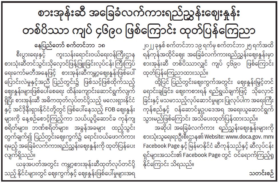စားအုန်းဆီ အခြေခံလက်ကားရည်ညွှန်းဈေးနှုန်း တစ်ပိဿ ကျပ် ၄၆၉၀ ဖြစ်ကြောင်း ထုတ်ပြန်ကြေညာ 09/19/2022 စားအုန်းဆီ အခြေခံလက်ကားရည်ညွှန်းဈေးနှုန်း တစ်ပိဿ ကျပ် ၄၆၉၀ ဖြစ်ကြောင်း ထုတ်ပြန်ကြေညာ