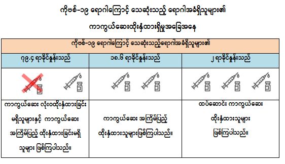သို့ဖြစ်ပါ၍ မြန်မာနိုင်ငံတွင် ကိုဗစ်-၁၉ ရောဂါကြောင့် သေဆုံးသူများအတွင်း နာတာ ရှည်ရောဂါ ရောဂါအခံရှိသူများ၏ ကာကွယ်ဆေးထိုးနှံမှုအခြေအနေကို  လေ့လာသုံး သပ်ချက်အရ အဆိုပါပုဂ္ဂိုလ်များအနက် ကာကွယ်ဆေး အကြိမ်ပြည့်ထိုးနှံထားသူများနှင့် ထပ်ဆောင်း ကာကွယ်ဆေးထိုးနှံထားသူများတွင် ကိုဗစ်-၁၉ ရောဂါကြောင့် သေဆုံးမှုကို သိသာစွာလျှော့ချ နိုင်ကြောင်းကို တွေ့ရှိရသည်ဖြစ်ရာ ဆီးချို၊ သွေးတိုး၊ နှလုံး၊ အသည်း၊ ကျောက်ကပ်၊ အဆုတ်၊ ကင်ဆာရောဂါ စသည်တို့ကဲ့သို့သော နာတာရှည်ရောဂါအခံတစ်ခုခုရှိသူ ပြည်သူများအနေဖြင့် ကိုဗစ်-၁၉ ရောဂါ ကာကွယ်ရေးစည်းမျဉ်းစည်းကမ်းများကို တိကျစွာ လိုက်နာခြင်း၊ ပါးစပ်နှင့် နှာခေါင်းစည်း (Mask) ကို စနစ်တကျတပ်ဆင်ခြင်းတို့အပြင် နီးစပ်ရာ ကျန်းမာရေးဌာနများ၊ ကျေးရွာ/ရပ်ကွက်အုပ်ချုပ်ရေးမှူးရုံးများနှင့်ဆက်သွယ်၍ ကိုဗစ်-၁၉ ရောဂါ ကာကွယ်ဆေးထိုး နှံမှုနှင့် ထပ်ဆောင်းကာကွယ်ဆေးများထိုးနှံခြင်းတို့ကို မပျက်မကွက် ဆောင်ရွက်ကြပါရန် အသိ ပေးနှိုးဆော်အပ်ပါသည်။