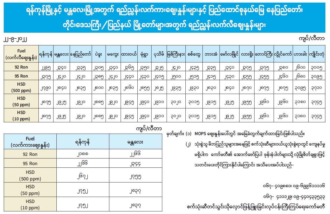 ရန်ကုန်မြို့နှင့် မန္တလေးမြို့အတွက် ရည်ညွှန်းလက်ကားဈေးနှုန်းများနှင့် ပြည်ထောင်စုနယ်မြေ နေပြည်တော်၊ တိုင်းဒေသကြီး/ပြည်နယ် မြို့တော်များအတွက် ရည်ညွှန်းလက်လီဈေးနှုန်းများ 09/22/2022