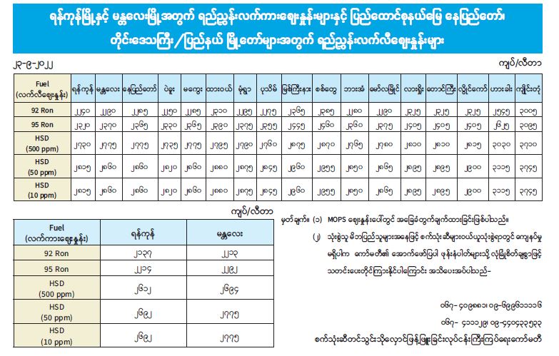 ရန်ကုန်မြို့နှင့် မန္တလေးမြို့အတွက် ရည်ညွှန်းလက်ကားဈေးနှုန်းများနှင့် ပြည်ထောင်စု နယ်မြေ နေပြည်တော်၊ တိုင်းဒေသကြီး/ပြည်နယ်မြို့တော်များအတွက် ရည်ညွှန်းလက်လီ ဈေးနှုန်းများ