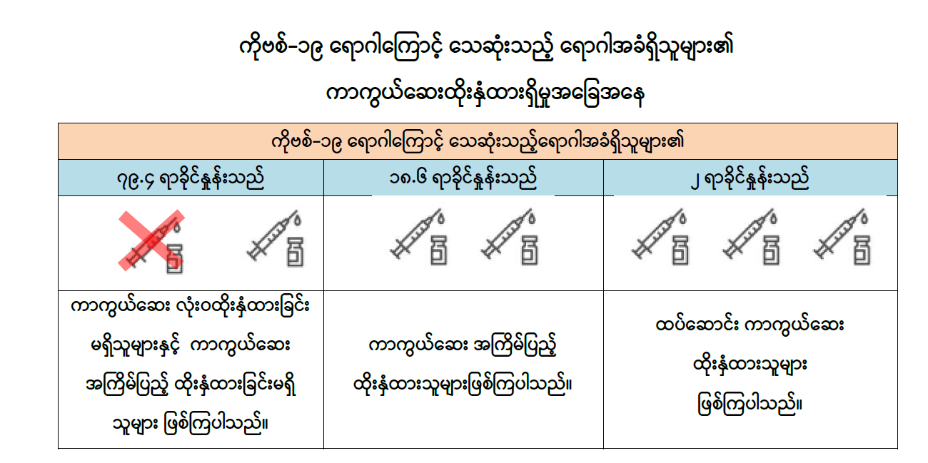 သို့ဖြစ်ပါ၍ မြန်မာနိုင်ငံတွင် ကိုဗစ်-၁၉ ရောဂါကြောင့် သေဆုံးသူများအတွင်း နာတာရှည်ရောဂါ ရောဂါအခံရှိသူများ၏ ကာကွယ်ဆေးထိုးနှံမှု အခြေအနေကို လေ့လာသုံးသပ်ချက်အရ အဆိုပါပုဂ္ဂိုလ်များအနက် ကာကွယ်ဆေး အကြိမ်ပြည့် ထိုးနှံထားသူများနှင့် ထပ်ဆောင်းကာကွယ်ဆေး ထိုးနှံထားသူများတွင် ကိုဗစ်-၁၉ ရောဂါကြောင့် သေဆုံးမှုကို သိသာစွာလျှော့ချနိုင်ကြောင်းကို တွေ့ရှိရသည်ဖြစ်ရာ ဆီးချို၊ သွေးတိုး၊ နှလုံး၊ အသည်း၊ ကျောက်ကပ်၊ အဆုတ်၊ ကင်ဆာရောဂါ စသည်တို့ကဲ့သို့သော နာတာရှည်ရောဂါ အခံတစ်ခုခုရှိသူ ပြည်သူများအနေဖြင့် ကိုဗစ်-၁၉ ရောဂါ ကာကွယ်ရေး စည်းမျဉ်း စည်းကမ်းများကို တိကျစွာ လိုက်နာခြင်း၊ ပါးစပ်နှင့် နှာခေါင်းစည်း (Mask) ကို စနစ်တကျ တပ်ဆင်ခြင်းတို့အပြင် နီးစပ်ရာ ကျန်းမာရေးဌာနများ၊ ကျေးရွာ/ ရပ်ကွက် အုပ်ချုပ်ရေးမှူးရုံးများနှင့် ဆက်သွယ်၍ ကိုဗစ်-၁၉ ရောဂါ ကာကွယ်ဆေးထိုးနှံမှုနှင့် ထပ်ဆောင်းကာကွယ်ဆေးများ ထိုးနှံခြင်းတို့ကို မပျက်မကွက် ဆောင်ရွက်ကြပါရန် အသိပေး နှိုးဆော်အပ်ပါသည်။