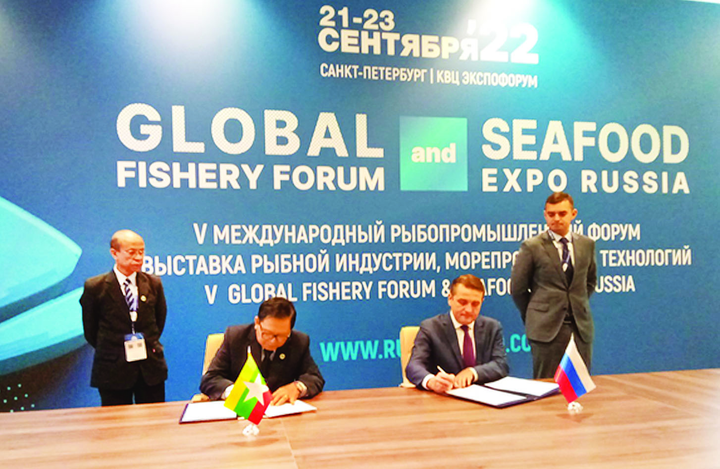 စက်တင်ဘာ ၂၂ ရက်တွင် ကျင်းပသည့် အပြည်ပြည်ဆိုင်ရာ ငါးလုပ်ငန်းဖိုရမ်နှင့် ရေထွက်ကုန်ပြပွဲ၌ စိုက်ပျိုးရေး၊ မွေးမြူရေးနှင့် ဆည်မြောင်းဝန်ကြီးဌာန ဒုတိယဝန်ကြီး ဒေါက်တာအောင်ကြီးနှင့် ရုရှားနိုင်ငံ Federal Fishery Agency of Russia အဖွဲ့အကြီးအကဲ Mr.Ilya Shestakov တို့က မြန်မာ- ရုရှားနှစ်နိုင်ငံအကြား ငါးလုပ်ငန်း ပူးပေါင်းဆောင်ရွက်မှု အကျိုးဖြစ်ထွန်းစေမည့်ကိစ္စများ အပါအဝင် ရေထွက်ကုန် အကျိုးဖြစ်ထွန်းစေမည့် ကဏ္ဍတွင် နှစ်နိုင်ငံ ပူးပေါင်းဆောင်ရွက်ရေးဆိုင်ရာ သဘောတူစာချုပ်ကို လက်မှတ်ရေးထိုးကြသည်။