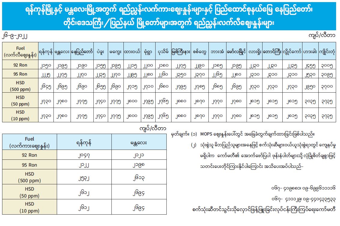 ရန်ကုန်မြို့နှင့် မန္တလေးမြို့အတွက် ရည်ညွှန်းလက်ကားဈေးနှုန်းများနှင့် ပြည်ထောင်စုနယ်မြေ နေပြည်တော်၊ တိုင်းဒေသကြီး/ပြည်နယ် မြို့တော်များအတွက် ရည်ညွှန်းလက်လီဈေးနှုန်းများ 09/26/2022