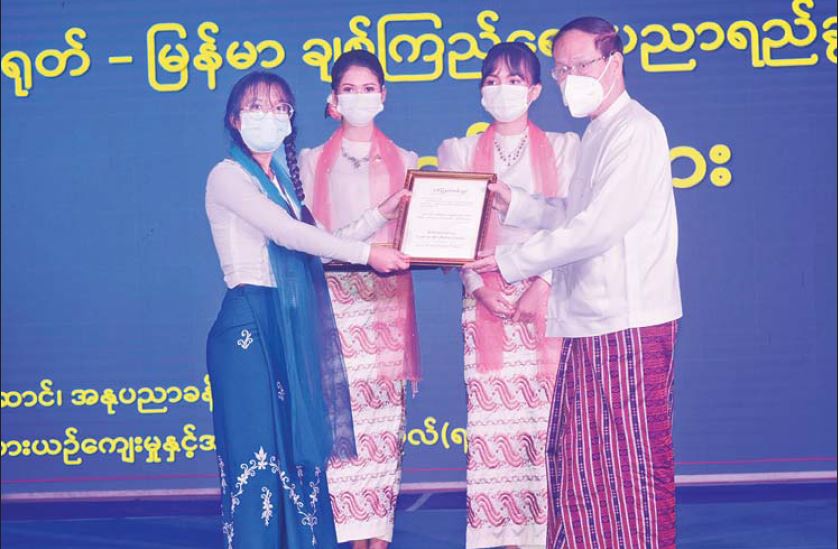 ယင်းနောက် တရုတ်-မြန်မာချစ်ကြည်ရေး ပညာရည်ချွန်ဆုရရှိသည့် ကျောင်းသား ကျောင်းသူများကို ပြည်ထောင်စုဝန်ကြီး၊ သံအမတ်ကြီးနှင့် ယဉ်ကျေးမှု သံမှူးကြီးတို့က ဆုများ ပေးအပ်ချီးမြှင့်ကြပြီး အခမ်းအနား ရုပ်သိမ်းလိုက်သည်။