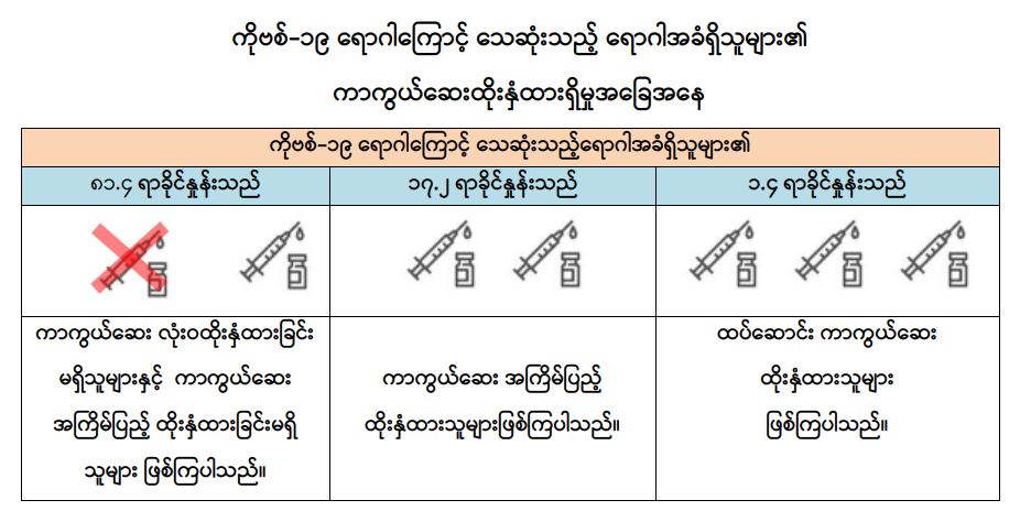 သို့ဖြစ်ပါ၍ မြန်မာနိုင်ငံတွင် ကိုဗစ်-၁၉ ရောဂါကြောင့် သေဆုံးသူများအတွင်း နာတာရှည် ရောဂါ ရောဂါအခံရှိသူများ၏ ကာကွယ်ဆေးထိုးနှံမှု အခြေအနေကို လေ့လာသုံးသပ်ချက်အရ အဆိုပါပုဂ္ဂိုလ်များအနက် ကာကွယ်ဆေး အကြိမ်ပြည့်ထိုးနှံထားသူများနှင့် ထပ်ဆောင်း ကာကွယ်ဆေးထိုးနှံထားသူများတွင် ကိုဗစ်-၁၉ ရောဂါကြောင့် သေဆုံးမှုကို သိသာစွာ လျှော့ချနိုင်ကြောင်းကို တွေ့ရှိရသည်ဖြစ်ရာ ဆီးချို၊ သွေးတိုး၊ နှလုံး၊ အသည်း၊ ကျောက်ကပ်၊ အဆုတ်၊ ကင်ဆာရောဂါ စသည်တို့ကဲ့သို့သော နာတာရှည်ရောဂါအခံ တစ်ခုခုရှိသူ ပြည်သူများအနေဖြင့် ကိုဗစ်-၁၉ ရောဂါ ကာကွယ်ရေးစည်းမျဉ်းစည်းကမ်းများကို တိကျစွာ လိုက်နာခြင်း၊ ပါးစပ်နှင့် နှာခေါင်းစည်း (Mask) ကို စနစ်တကျ တပ်ဆင်ခြင်းတို့အပြင် နီးစပ်ရာ ကျန်းမာရေးဌာနများ၊ ကျေးရွာ/ရပ်ကွက် အုပ်ချုပ်ရေးမှူးရုံးများနှင့် ဆက်သွယ်၍ ကိုဗစ်-၁၉ ရောဂါ ကာကွယ်ဆေး ထိုးနှံမှုနှင့် ထပ်ဆောင်းကာကွယ်ဆေးများ ထိုးနှံခြင်းတို့ကို မပျက်မကွက် ဆောင်ရွက်ကြပါရန် အသိပေးနှိုးဆော်အပ်ပါသည်။