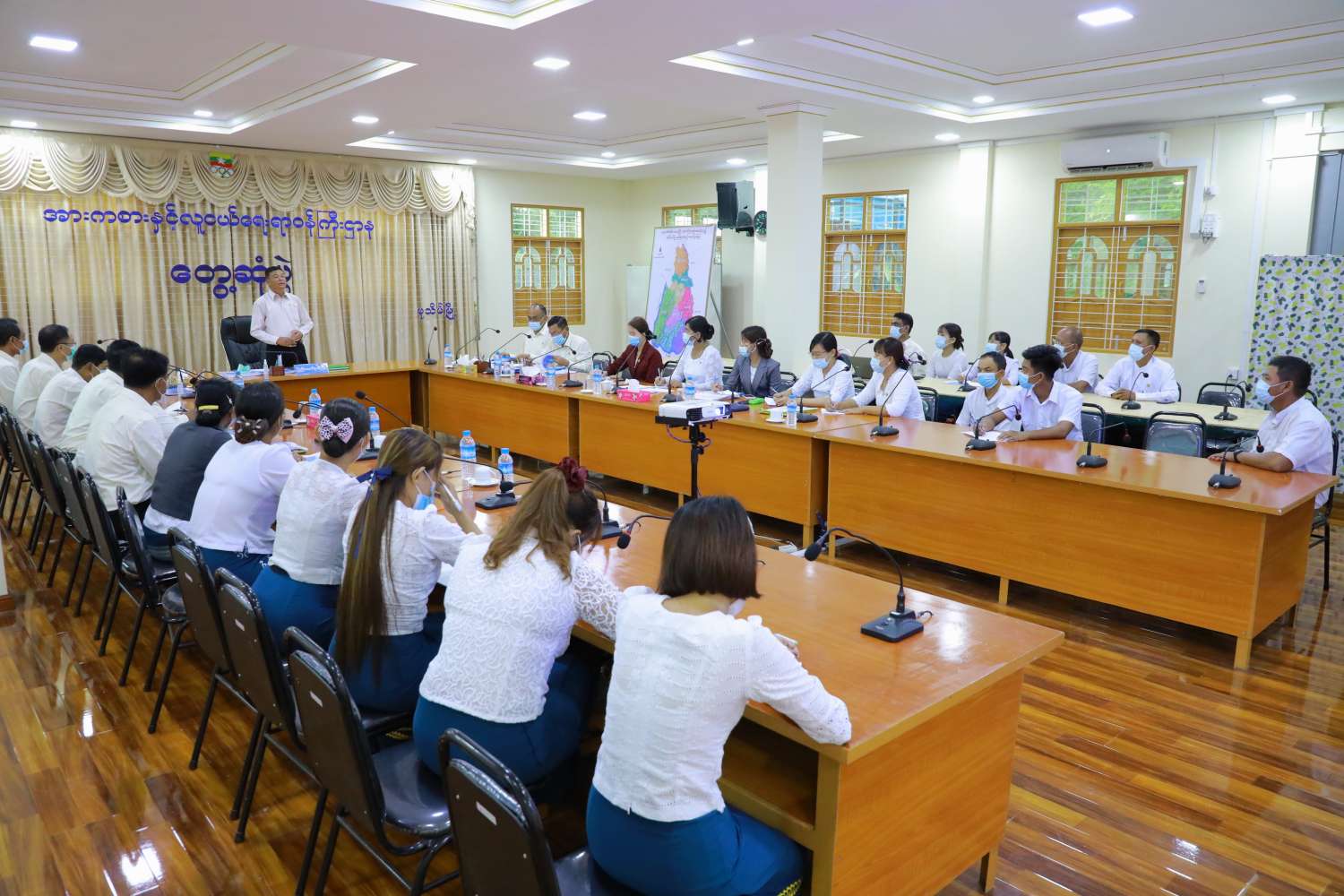 ဆက်လက်၍ ပြည်ထောင်စုဝန်ကြီးနှင့် အဖွဲ့သည် တိုင်းဒေသကြီး အတွင်းရှိ အားကစားနှင့် ကာယပညာ ဦးစီးဌာနမှ အရာထမ်း၊ အမှုထမ်းများနှင့် တွေ့ဆုံပြီး အဖွဲ့အစည်းဖြင့် လုပ်ဆောင် ရသည့်လုပ်ငန်း ဖြစ်သည့်အတွက် စည်းလုံးညီညွတ်မှု ရှိရန်နှင့် မိသားစုစိတ်ဓာတ် ထားရှိပြီး တစ်ဦးနှင့်တစ်ဦး အထက်အောက် အပြန်အလှန် ကူညီဖေးမ ဆောင်ရွက် လုပ်ကိုင်ကြရန်လို ကြောင်း၊ အခက်အခဲများနှင့် အခြားလိုအပ်သည်များ ရှိပါက တာဝန်ရှိသူများမှ တစ်ဆင့် အချိန် မရွေး တင်ပြနိုင်ကြောင်း မိမိအနေဖြင့် အတတ်နိုင်ဆုံး ကူညီဖြည့်ဆည်း ဆောင်ရွက်ပေးသွားမည် ဖြစ်ကြောင်း ပြောကြားသည်။