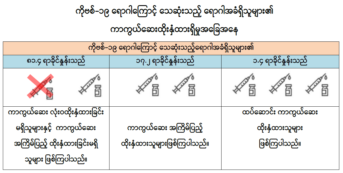 ကိုဗစ်-၁၉ ရောဂါကြောင့် သေဆုံးသည့် ရောဂါအခံ ရှိသူများ၏ ၈၁.၄ ရာခိုင်နှုန်းသည် ၁၇.၂ ရာခိုင်နှုန်းသည် ၁.၄ ရာခိုင်နှုန်းသည် ကာကွယ်ဆေး လုံးဝထိုးနှံထားခြင်း မရှိသူများနှင့် ကာကွယ်ဆေး အကြိမ်ပြည့် ထိုးနှံထားခြင်း မရှိသူများ ဖြစ်ကြပါသည်။ ကာကွယ်ဆေး အကြိမ်ပြည့် ထိုးနှံထားသူများ ဖြစ်ကြပါသည်။ ထပ်ဆောင်း ကာကွယ်ဆေး ထိုးနှံထားသူများ ဖြစ်ကြပါသည်။
