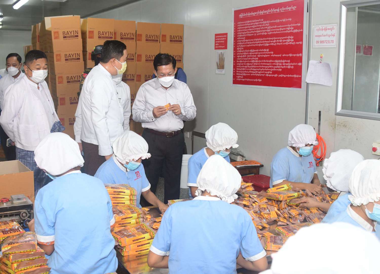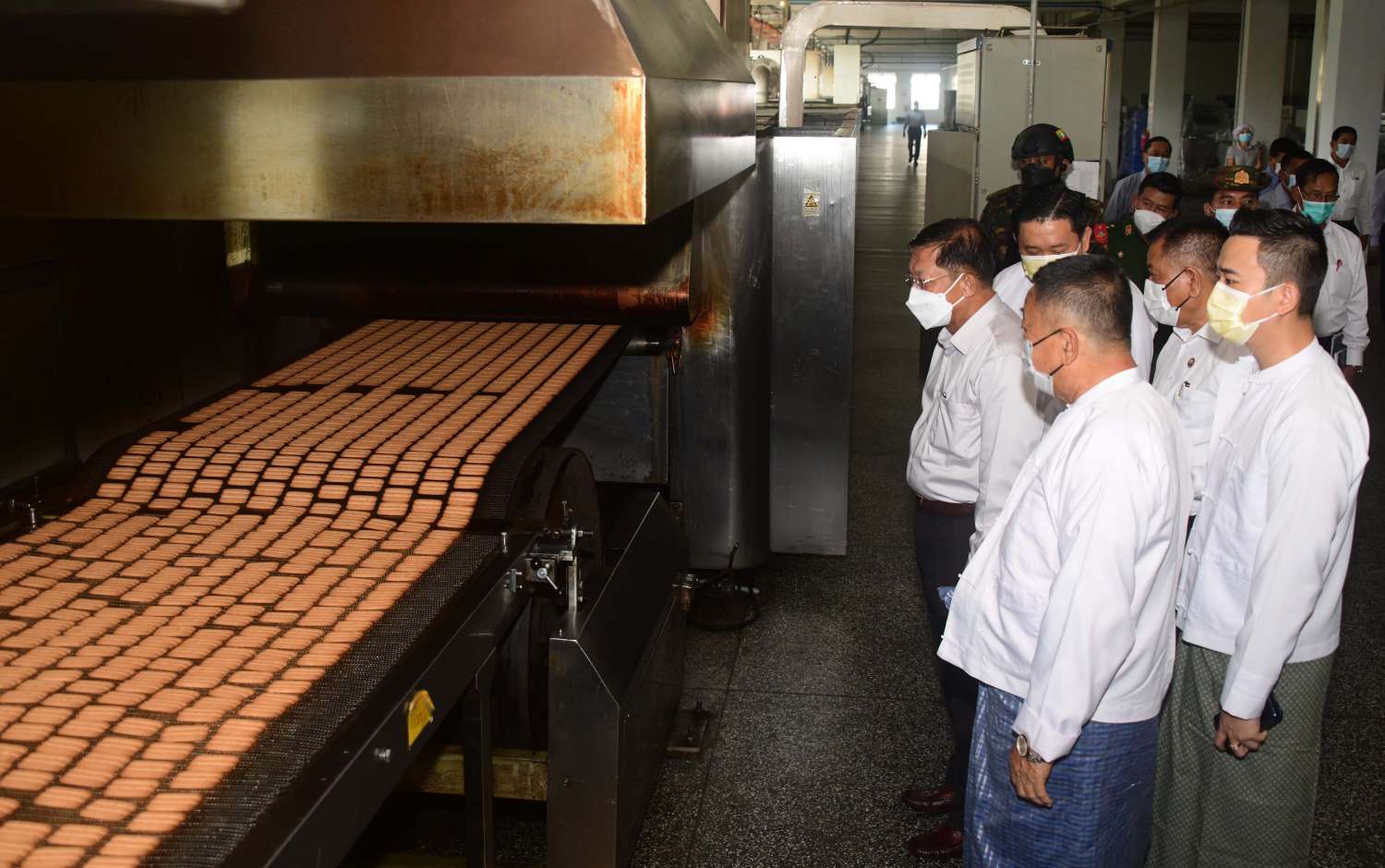 ဦးစွာ နိုင်ငံတော် စီမံအုပ်ချုပ်ရေး ကောင်စီ ဥက္ကဋ္ဌ နိုင်ငံတော် ဝန်ကြီးချုပ်နှင့် အဖွဲ့ဝင်များသည် ပြည်ကြီးတံခွန် မြို့နယ်ရှိ Super Mandalay Co.Ltd ၏ ဘုရင် ဘီစကစ်စက်ရုံသို့ ရောက်ရှိကြရာ လုပ်ငန်းရှင် ဦးမြင့်စိန်နှင့် အဖွဲ့ဝင်များက ကြိုဆိုနှုတ် ဆက်ကြသည်။ ထို့နောက်စက်ရုံအတွင်း ကုန်ကြမ်းအဆင့်မှထုပ်ပိုးမှုအထိ ကုန်ပစ္စည် များ အဆင့်ဆင့် ထုတ်လုပ်နေမှု အခြေအနေများကို လိုက်လံရှင်းလင်းပြသရာ နိုင်ငံတော် စီမံအုပ်ချုပ်ရေး ကောင်စီ ဥက္ကဋ္ဌ နိုင်ငံတော် ဝန်ကြီးချုပ်က သိရှိလိုသည်များ ပြန်လည်မေးမြန်း ဆွေးနွေး ပြောကြားသည်။