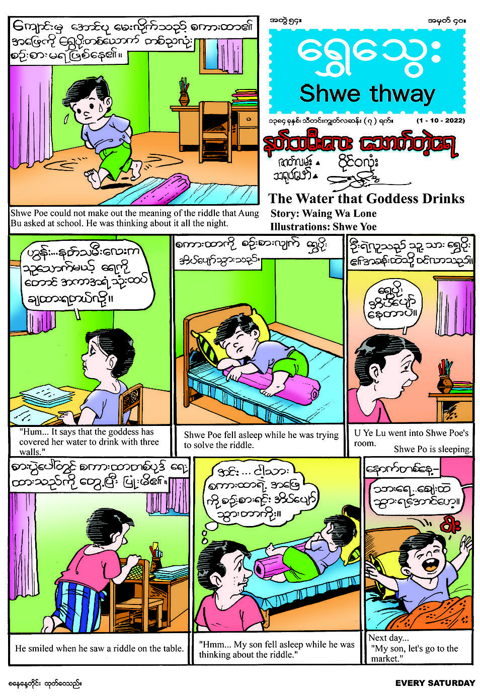 ၁-၁၀-၂၀၂၂ ရက်(စနေနေ့)တွင် ထွက်ရှိမည့် ရွှေသွေးဂျာနယ် အတွဲ (၅၄)၊ အမှတ် (၄၀) တွင် ဖခင်ဖြစ်သူက ရွှေပိုးသိချင်သော စကားထာရဲ့ အဖြေကို လက်တွေ့ပြပေးလိုက်သည့် အကြောင်း ရေးဖွဲ့ထားသည့် “နတ်သမီးလေး သောက်တဲ့ရေ” မျက်နှာဖုံးကာတွန်းဇာတ်လမ်း၊ ခန္ဓာကိုယ် ကြီးထွားဖွံ့ဖြိုးမှုနှင့် ကျန်းမာရေး ကောင်းမွန်စေရန်အတွက် လိုအပ်သော အာဟာရ ဓာတ်များစွာ ပါဝင်သော နို့အကြောင်း ဗဟုသုတ ဖြစ်ဖွယ်ရေးသားတင်ပြထားသည့် “လူတို့အတွက် အာဟာရတန်ဖိုး မြင့်မားသောနို့” သုတကဏ္ဍ၊ အသားဟင်း ကောင်းကောင်း စားချင်၍ ဆရာမ အိမ်ကို လာလည်ပြီး ထမင်းစားမည်ဟု ဦးလေး ဖြစ်သူကို ညာပြောထားသည့် အကြောင်း တင်ဆက် ထားသည့် “ရန်ပိုင်စိုး” နှစ်မျက်နှာ ကာတွန်းဇာတ်လမ်း၊ မောင်လေး၏ မုန့်များကို မြင်တိုင်း မြည်းကြည့်တတ်သည့် အစ်မနှင့် ငရုတ်သီးအစစ်ကို သကြားချောင်း ငရုတ်သီးဟု ထင်မှတ်ကာ မြည်းမိသည့် အကြောင်း တင်ဆက်ထားသည့် “မြည်းဦးလေ” တစ်မျက်နှာကာတွန်း၊ လင်းယုန်၏ရန်မှ ရှဉ့်ညိုလေး၏အသက်ကို အကြံပေးကာ ကယ်တင်ပေးခဲ့သော မျောက်ညို လေးသည် သူ၏ ဝင့်ကြွားသော စကားသံကြောင့် ဒုက္ခရောက်ရပုံကို တင်ဆက်ထားသည့် “ဝင့်ကြွားတဲ့ မျောက်ညို”နှစ်မျက်နှာ ကာတွန်း၊ ညီအစ်ကို နှစ်ယောက်သည် မိဘများ၏ အမွေ များကို ညီတူညီမျှ ရရှိခဲ့သော်လည်း လောဘကြီးသည့် အစ်ကိုက ညီဖြစ်သူ၏ အမွေများကို လိုချင်၍ ကြံစည်ရာမှ ဒုက္ခရောက်ခဲ့ရပုံ အကြောင်းကို တင်ဆက်ထားသည့် “လောဘမီး” နှစ်မျက်နှာ ကာတွန်း၊ မြန်မာတို့၏ အစဉ်အလာအတိုင်း သံဃာတော်များအား ဆွမ်းချက် လောင်းလှူ သည့်အကြောင်း ရေးဖွဲ့ထားသည့် “မြန်မာ့ဂုဏ်” ကဗျာကဏ္ဍ၊ အင်္ဂလိပ်စာ သင်ခန်းစာကဏ္ဍ၊ ဉာဏ်စမ်း ကဏ္ဍ၊ ဝတ္ထုကဏ္ဍ၊ ပုံပြင်ကဏ္ဍနှင့် ကဗျာကဏ္ဍတို့ အပါအဝင် ကဏ္ဍစုံလင်စွာ ထွက်ရှိပြီဖြစ်ရာ တစ်စောင်လျှင် ငွေကျပ် ၄၀၀ ဖြင့် စာပေဗိမာန် စာအုပ် အရောင်းဆိုင်များတွင် ဝယ်ယူနိုင်ကြောင်း သိရသည်။