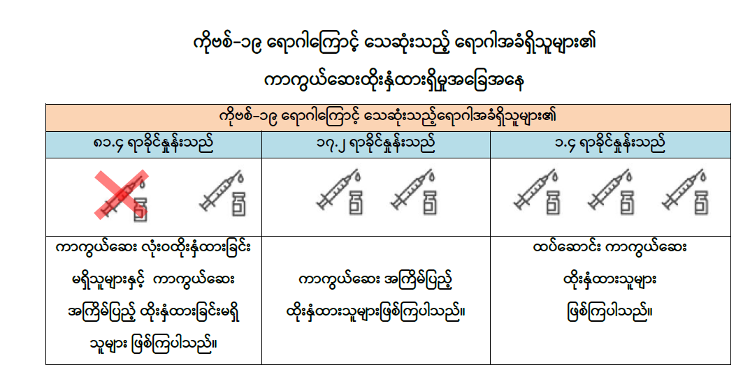 သို့ဖြစ်ပါ၍ မြန်မာနိုင်ငံတွင် ကိုဗစ်-၁၉ ရောဂါကြောင့် သေဆုံးသူများအတွင်း နာတာရှည် ရောဂါ ရောဂါအခံရှိသူများ၏ ကာကွယ်ဆေးထိုးနှံမှုအခြေအနေကို လေ့လာသုံးသပ်ချက်အရ အဆိုပါပုဂ္ဂိုလ်များအနက် ကာကွယ်ဆေးအကြိမ်ပြည့် ထိုးနှံထားသူများနှင့် ထပ်ဆောင်း ကာကွယ်ဆေး ထိုးနှံထားသူများတွင် ကိုဗစ်-၁၉ ရောဂါကြောင့် သေဆုံးမှုကို သိသာစွာ လျှော့ချနိုင်ကြောင်းကို တွေ့ရှိရသည်ဖြစ်ရာ ဆီးချို၊ သွေးတိုး၊ နှလုံး၊ အသည်း၊ ကျောက်ကပ်၊ အဆုတ်၊ ကင်ဆာရောဂါ စသည်တို့ကဲ့သို့သော နာတာရှည် ရောဂါအခံတစ်ခုခုရှိသူ ပြည်သူများအနေဖြင့် ကိုဗစ်-၁၉ ရောဂါ ကာကွယ်ရေးစည်းမျဉ်း စည်းကမ်းများကို တိကျစွာ လိုက်နာခြင်း၊ ပါးစပ်နှင့် နှာခေါင်းစည်း (Mask) ကို စနစ်တကျ တပ်ဆင်ခြင်းတို့အပြင် နီးစပ်ရာ ကျန်းမာရေးဌာနများ၊ ကျေးရွာ/ ရပ်ကွက် အုပ်ချုပ်ရေးမှူးရုံးများနှင့် ဆက်သွယ်၍ ကိုဗစ်-၁၉ ရောဂါ ကာကွယ်ဆေးထိုးနှံမှုနှင့် ထပ်ဆောင်းကာကွယ်ဆေးများ ထိုးနှံခြင်းတို့ကို မပျက်မကွက် ဆောင်ရွက်ကြပါရန် အသိပေး နှိုးဆော်အပ်ပါသည်။