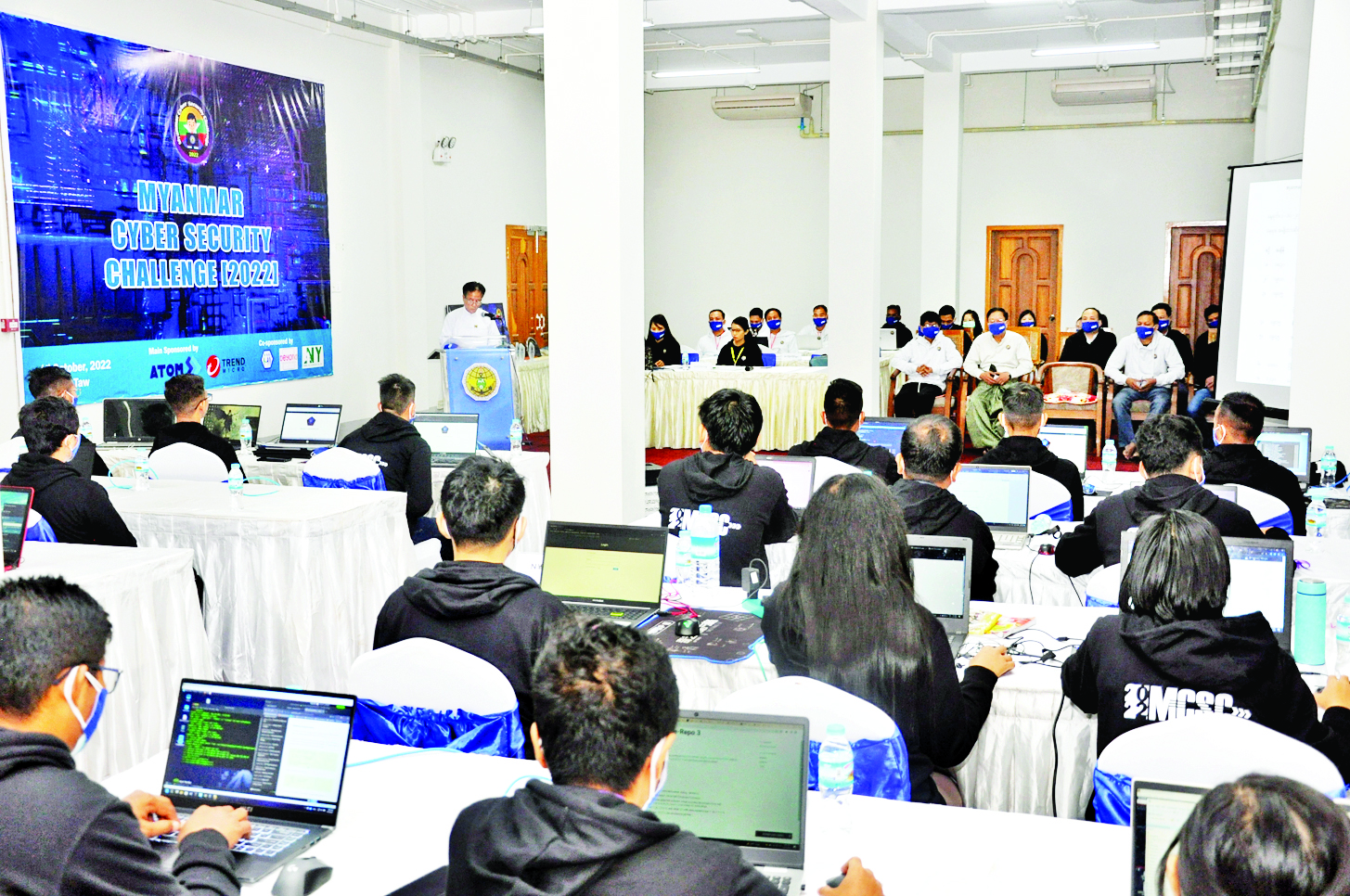 ဆိုက်ဘာလုံခြုံရေး လူ့စွမ်းအားအရင်းအမြစ် ဖွံ့ဖြိုးတိုးတက်လာစေရန်၊ လူငယ်များအကြား ဆိုက်ဘာလုံခြုံရေး အသိပညာပြန့်ပွားစေရန်နှင့် ဆိုက်ဘာလုံခြုံရေးဆိုင်ရာ အသက်မွေးဝမ်းကျောင်းမှု အခွင့်အလမ်းများ တိုးတက်လာစေရန် ရည်ရွယ်ပြီး ပို့ဆောင်ရေးနှင့် ဆက်သွယ်ရေးဝန်ကြီးဌာနက ကြီးမှူးကျင်းပသည့် Myanmar Cyber Security Challenge 2022 (အလွတ်တန်းအဆင့်) ပြိုင်ပွဲကို ယနေ့တွင် ပို့ဆောင်ရေးနှင့်ဆက်သွယ်ရေးဝန်ကြီးဌာန သတင်းအချက်အလက်နည်းပညာနှင့် ဆိုက်ဘာလုံခြုံရေးဦးစီးဌာန၊ အမျိုးသားဆိုက်ဘာ လုံခြုံရေးဗဟိုဌာနအဆောက်အအုံ၌ ကျင်းပရာ ပို့ဆောင်ရေးနှင့်ဆက်သွယ်ရေးဝန်ကြီးဌာနမှ တာဝန်ရှိသူများ၊ ပံ့ပိုးကူညီသူများနှင့် ပြိုင်ပွဲအားစိတ်ပါဝင်စားသူများ တက်ရောက်အားပေးကြသည်။