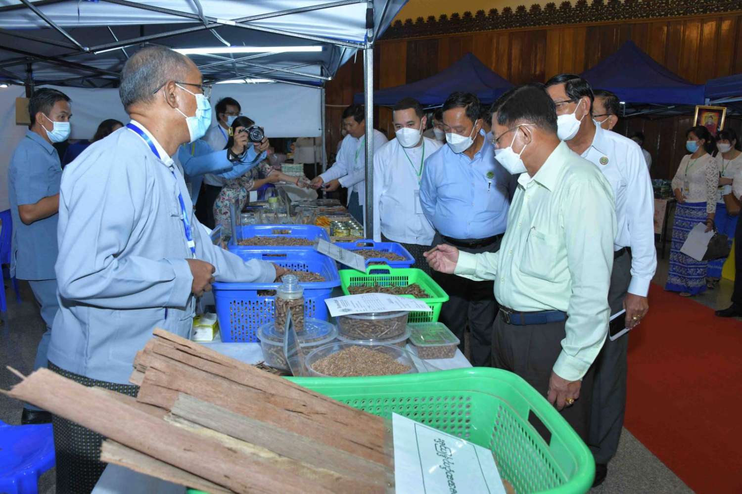 ထို့နောက် နိုင်ငံတော်စီမံအုပ်ချုပ်ရေးကောင်စီဥက္ကဋ္ဌ နိုင်ငံတော်ဝန်ကြီးချုပ်သည် ခင်းကျင်းပြသထားသည့် အသေးစား၊ အငယ်စားနှင့် အလတ်စား စီးပွားရေး (MSME) လုပ်ငန်းရှင်များ၏ လှုပ်ရှားမှုမှတ်တမ်းဓာတ်ပုံများ၊ စားသောက်ကုန်၊ လူသုံးကုန်၊ စက်မှုလက်မှုထုတ်ကုန်၊ မြန်မာ့ရိုးရာလက်မှုထုတ်ကုန်များ၊ ကျောက်မျက်ရတနာ ထုတ်ကုန်များ၊ အဝတ်အထည်များ၊ တိုင်းရင်းဆေးများ စသည့်ထုတ်ကုန်ပစ္စည်းများ ခင်းကျင်းပြသထားရှိမှုများကို ပြကွက်တစ်ခုချင်းစီအလိုက် စိတ်ဝင်တစားဖြင့် လေ့လာခဲ့ပြီး ဈေးကွက်ရရှိမှုအခြေအနေများကို မေးမြန်းဆွေးနွေးရာ လုပ်ငန်းအလိုက် တာဝန်ခံများက လိုက်လံ ရှင်းလင်းတင်ပြခဲ့ကြကြောင်း သတင်းရရှိသည်။